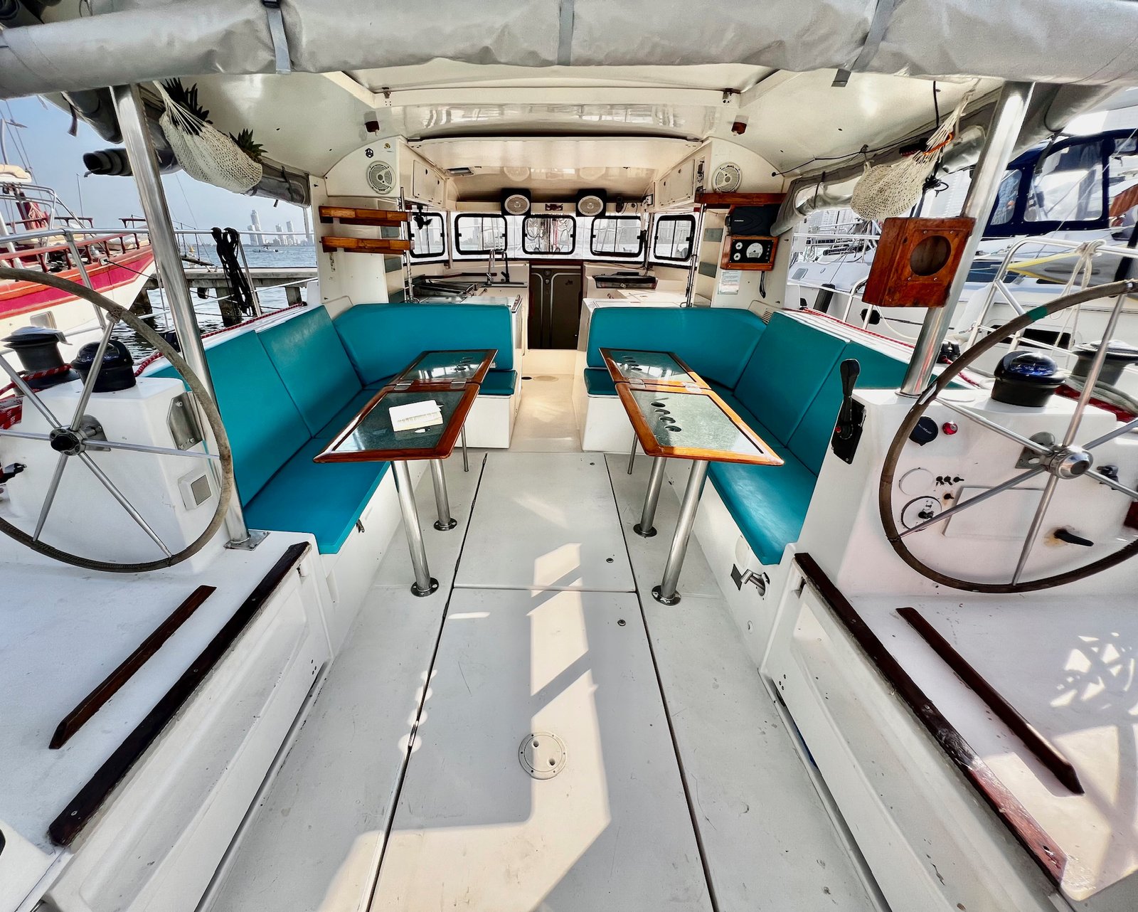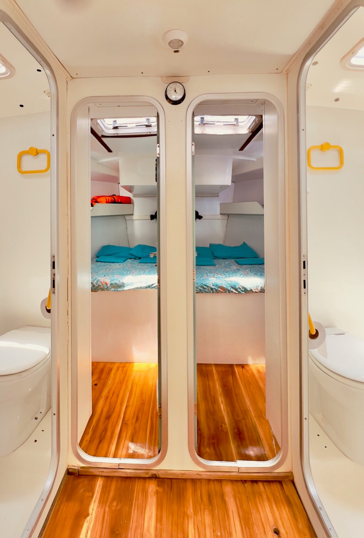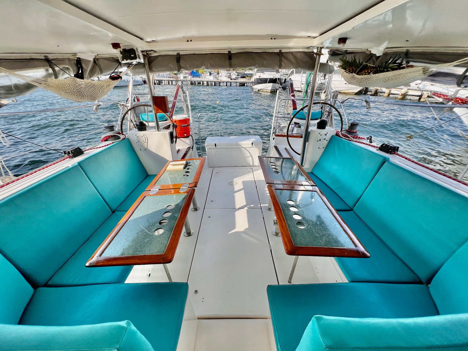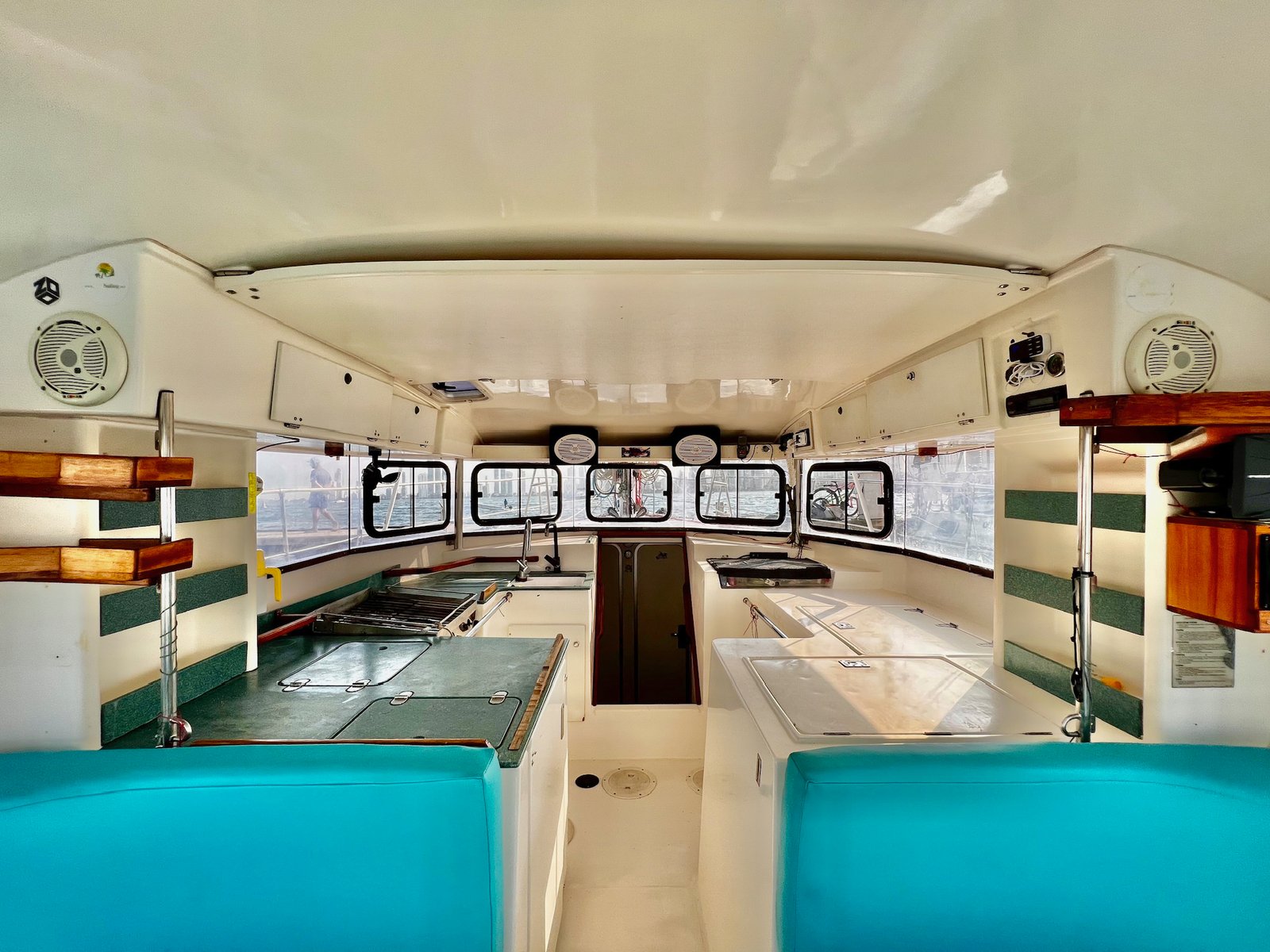 Big Fish I, like its sister Big Fish II, is a 43 foot Atoll 6, designed by Philippe Briand. It was built in 1999 by DUFOUR. Atoll sailboats have been specifically designed for charters in the Caribbean and have a similar style to a catamaran as their salon and kitchen are above deck. It takes up to 10 passengers distributed throughout four cabins. There are two private double cabins and two triple cabins with a double bed and one single bunk in each. There are two shared electric bathrooms. Big Fish I has ample shady lounging space in the salon and room to sunbathe on deck.