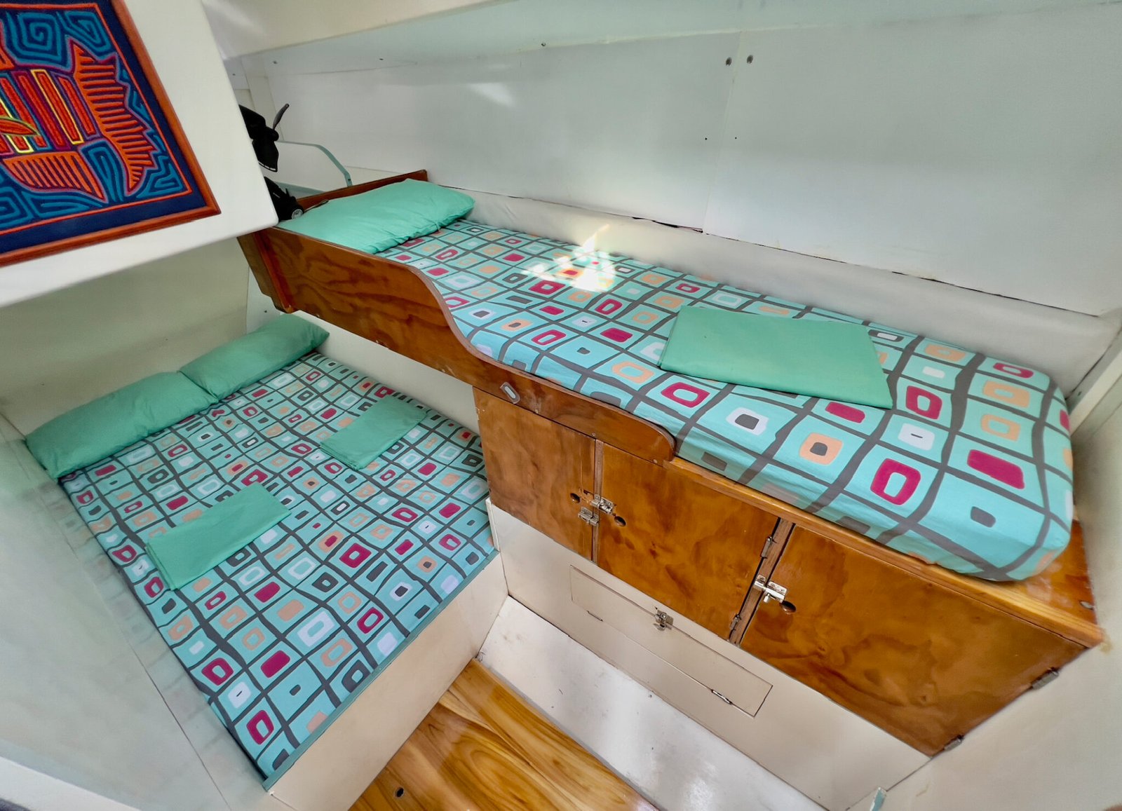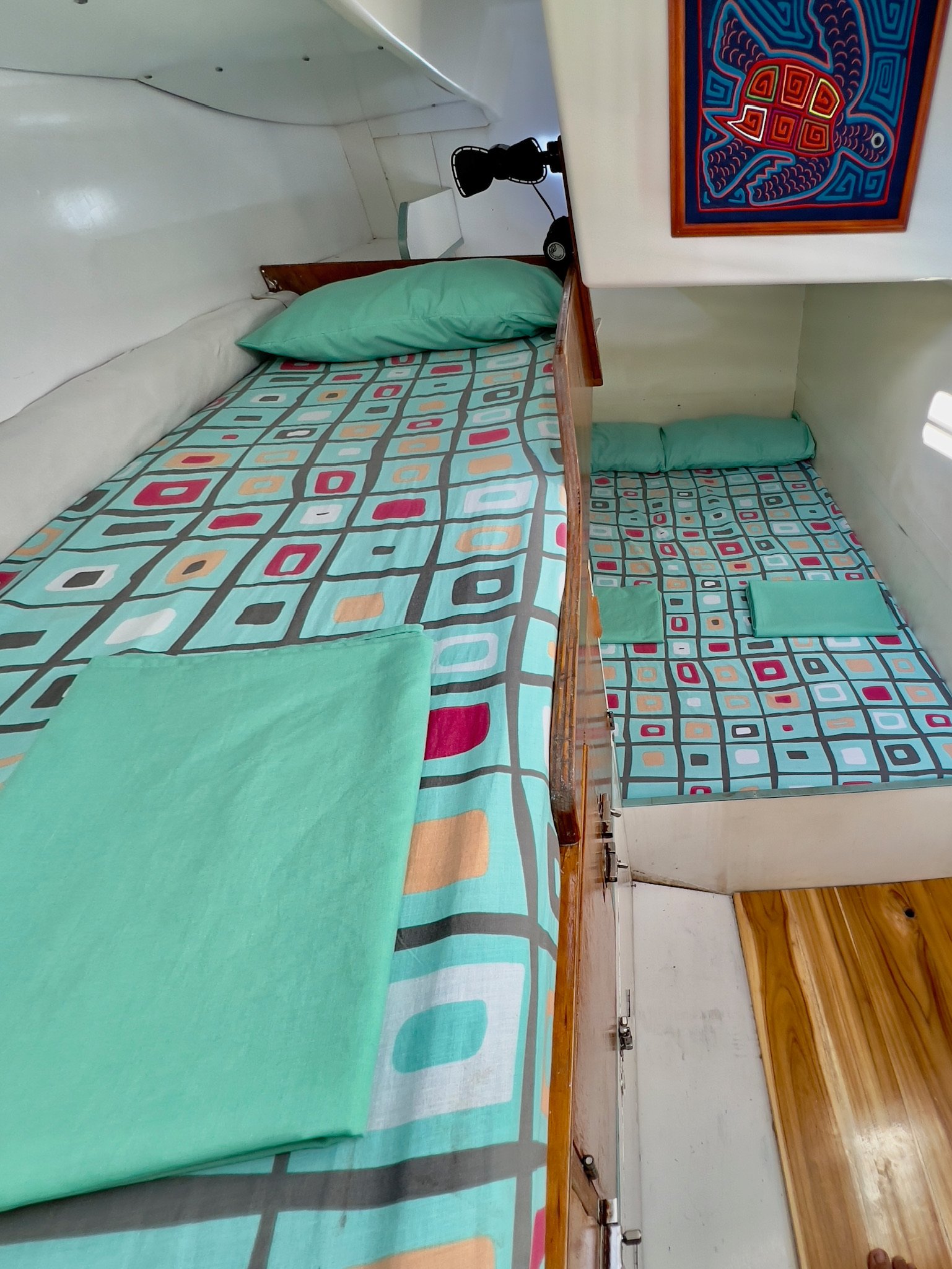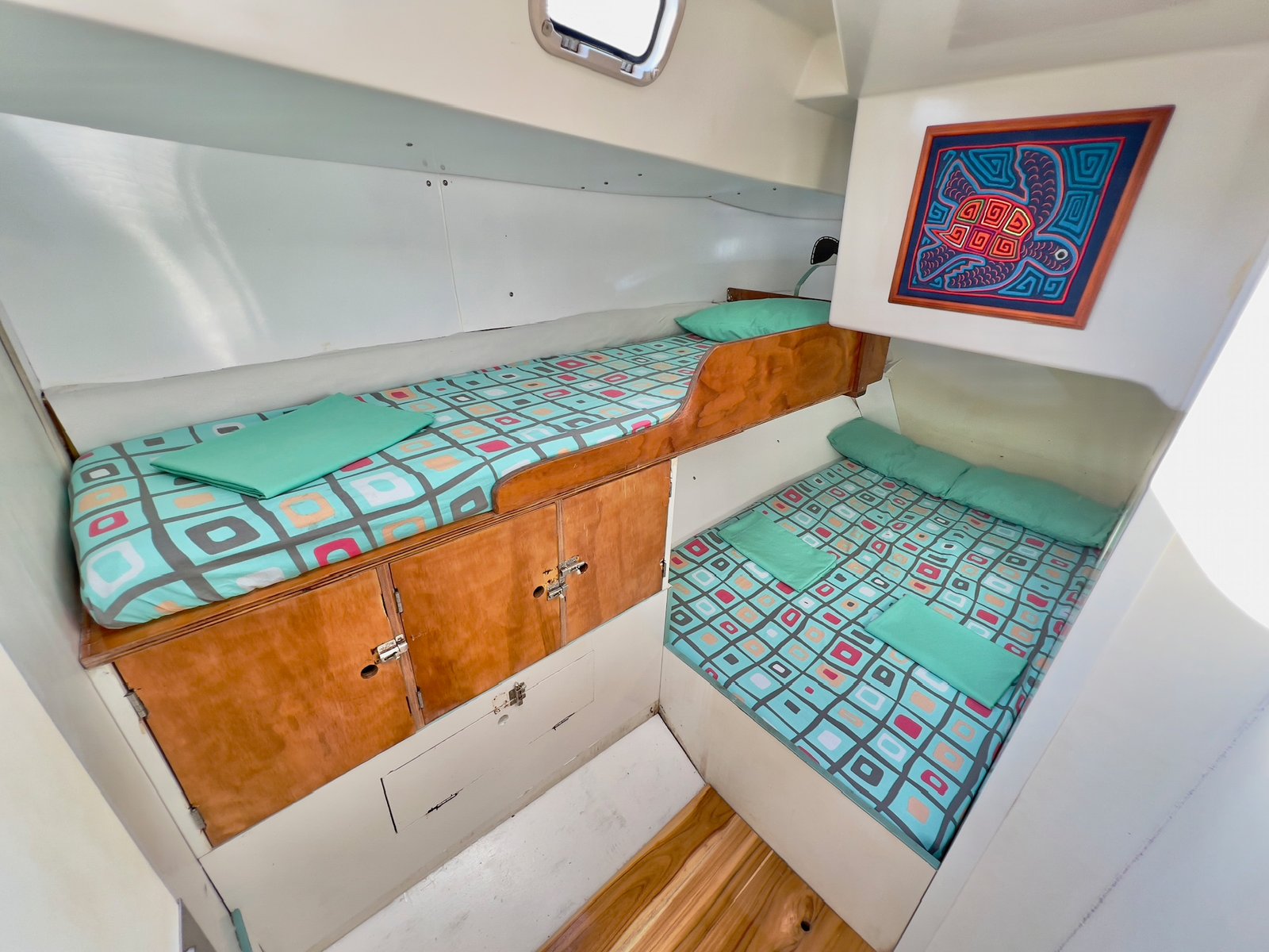 Big Fish I, like its sister Big Fish II, is a 43 foot Atoll 6, designed by Philippe Briand. It was built in 1999 by DUFOUR. Atoll sailboats have been specifically designed for charters in the Caribbean and have a similar style to a catamaran as their salon and kitchen are above deck. It takes up to 10 passengers distributed throughout four cabins. There are two private double cabins and two triple cabins with a double bed and one single bunk in each. There are two shared electric bathrooms. Big Fish I has ample shady lounging space in the salon and room to sunbathe on deck.