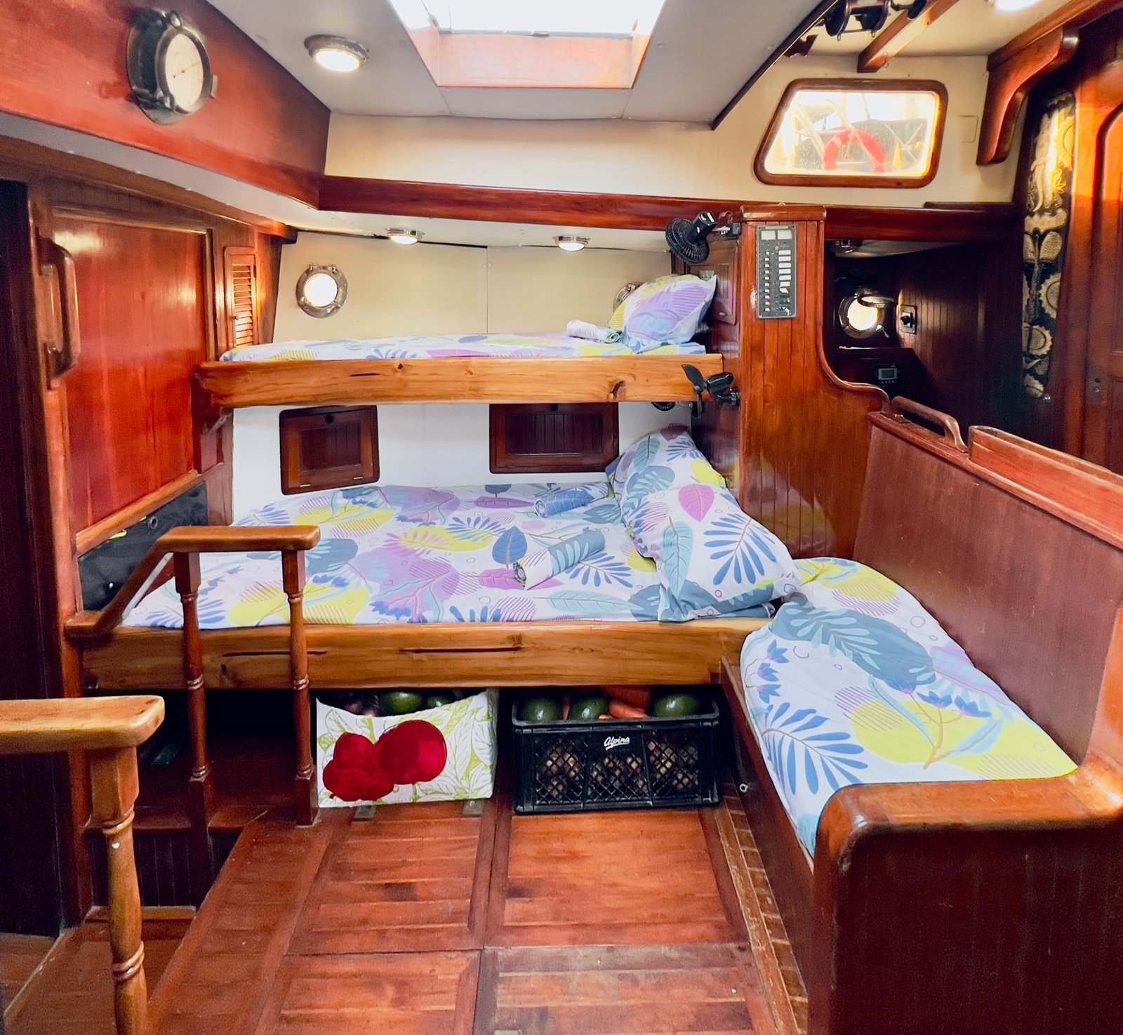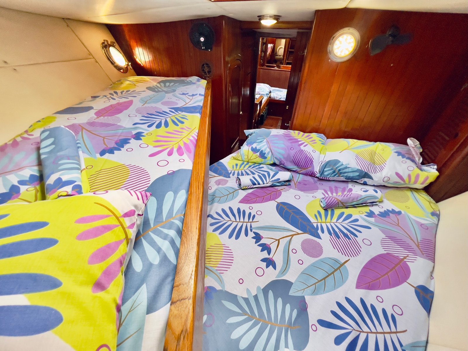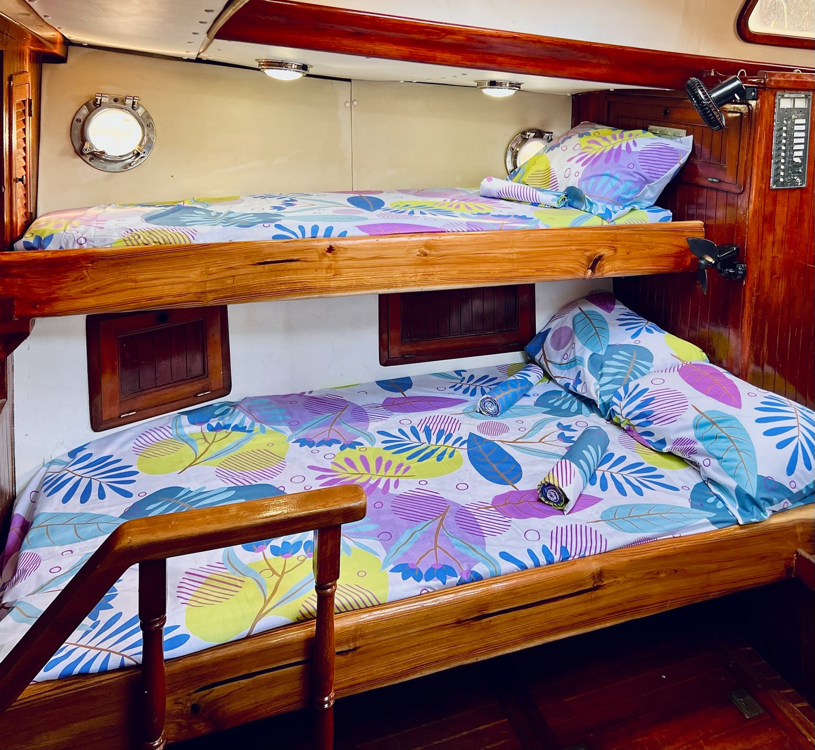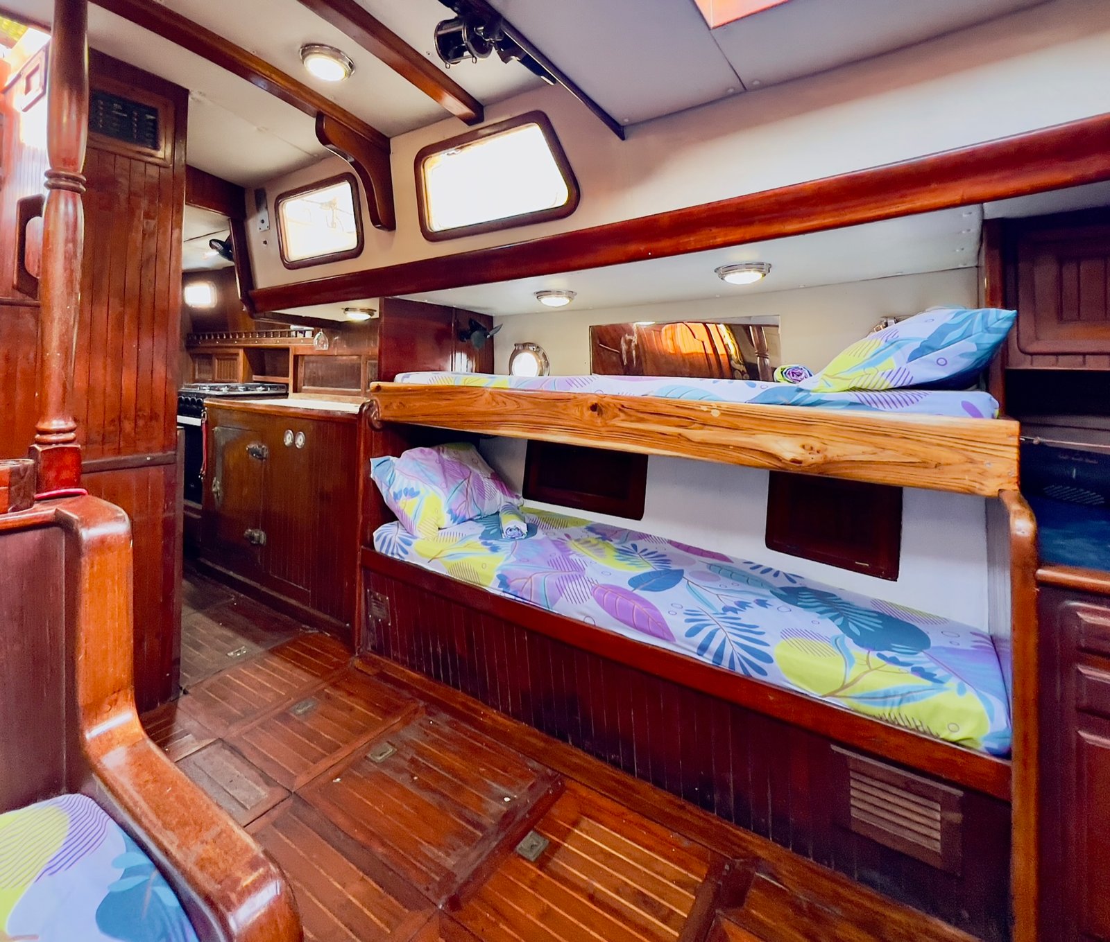 Fantasy is the sister boat to the Sophia, it is also a 51 foot Vagabond Ketch sailing boat. It was built in 1985 and has a beautiful classic design. It takes up to 10 passengers, with a three person cabin in the bow with a double bed and a single bunk above. There is also one private cabin with two single bunks and in the main saloon there are three single bunks and one double bed. There is a large aft cabin with a king size bed, this is usually reserved for crew.