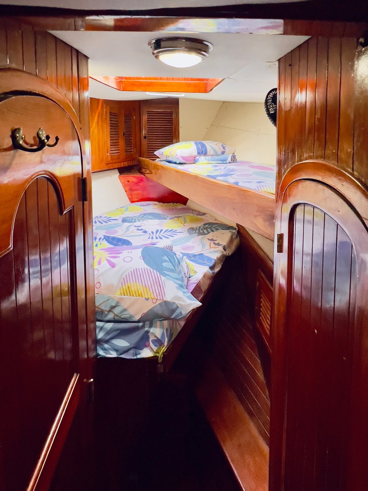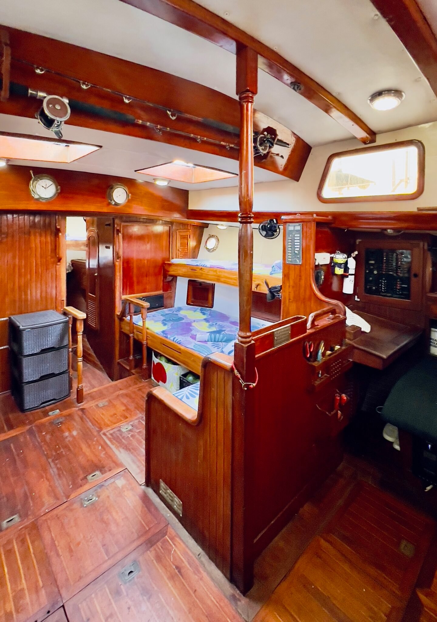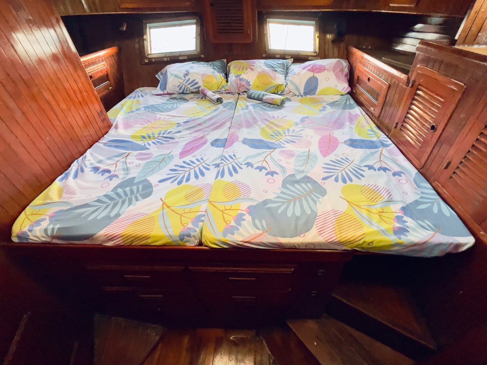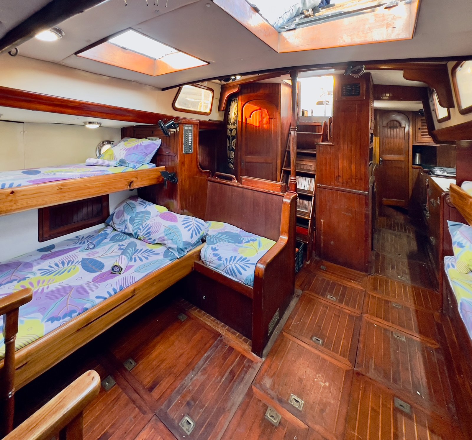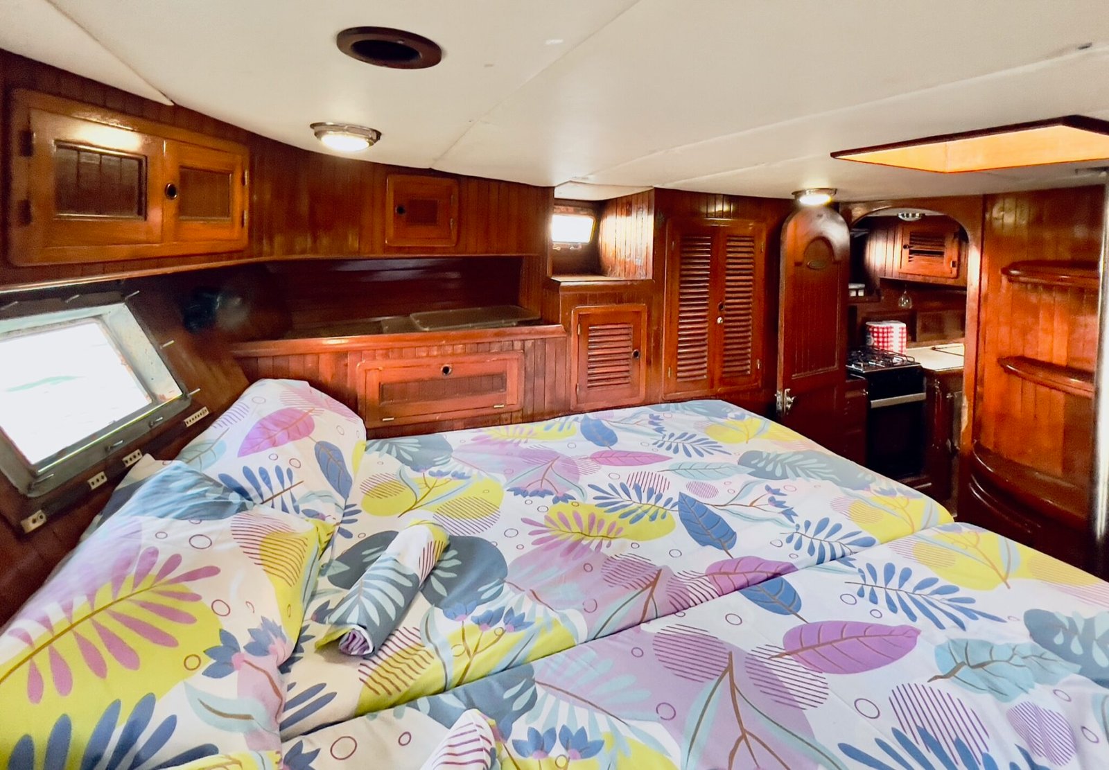 Fantasy is the sister boat to the Sophia, it is also a 51 foot Vagabond Ketch sailing boat. It was built in 1985 and has a beautiful classic design. It takes up to 10 passengers, with a three person cabin in the bow with a double bed and a single bunk above. There is also one private cabin with two single bunks and in the main saloon there are three single bunks and one double bed. There is a large aft cabin with a king size bed, this is usually reserved for crew.