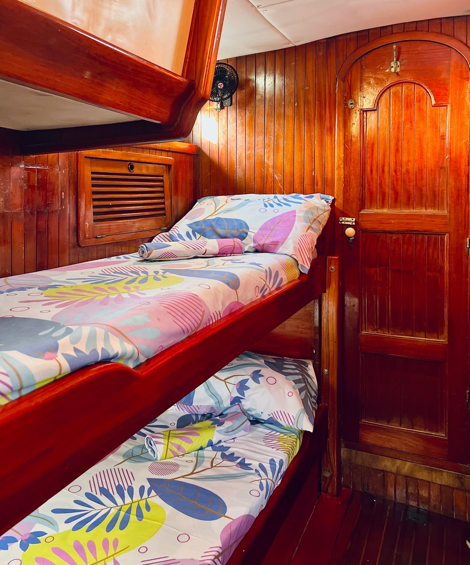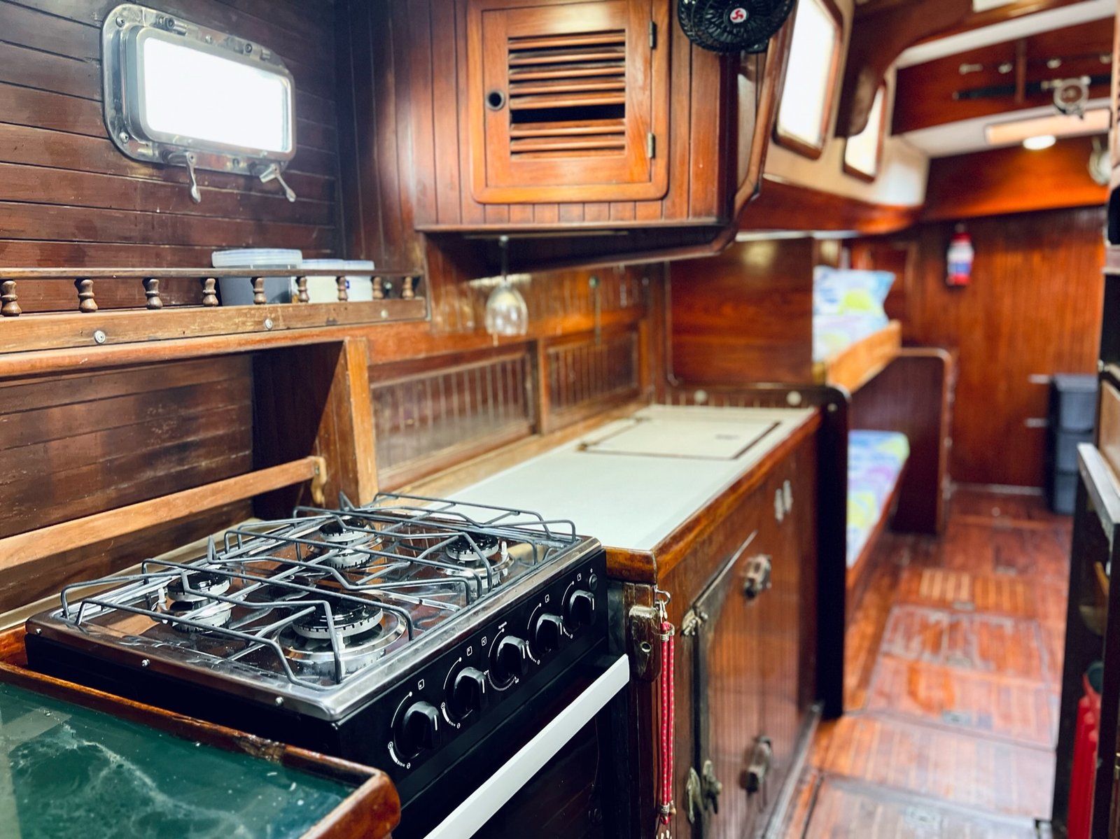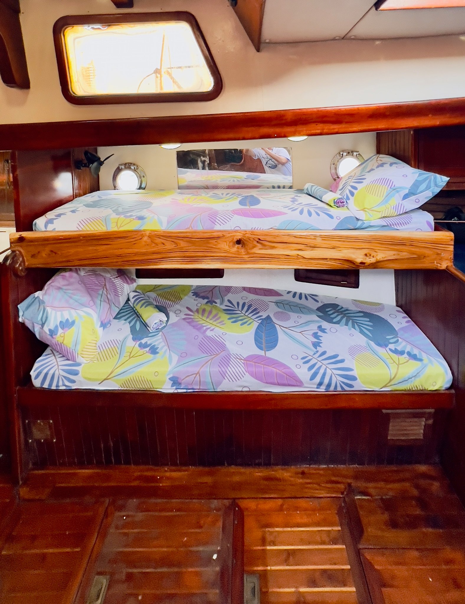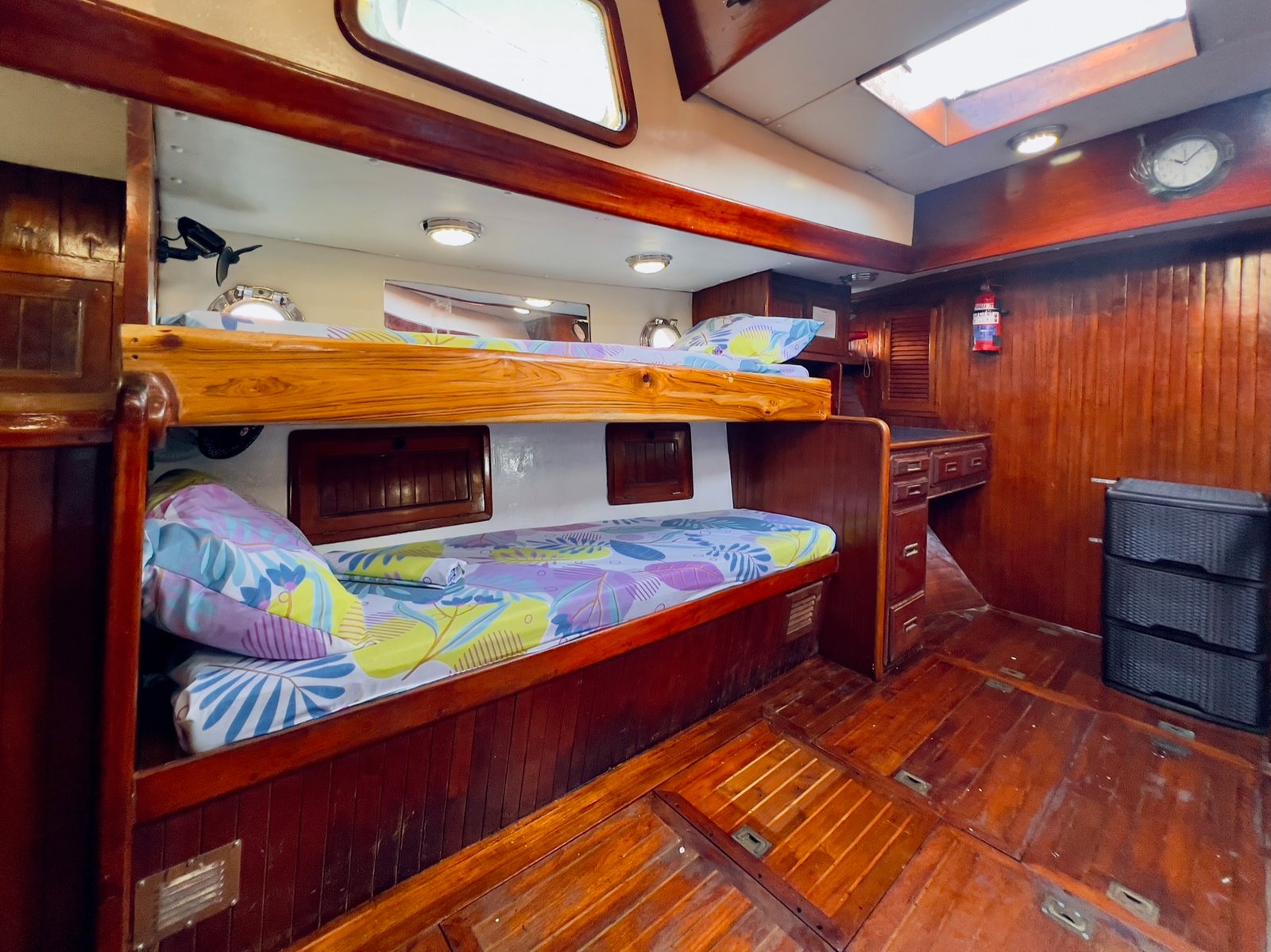 Fantasy is the sister boat to the Sophia, it is also a 51 foot Vagabond Ketch sailing boat. It was built in 1985 and has a beautiful classic design. It takes up to 10 passengers, with a three person cabin in the bow with a double bed and a single bunk above. There is also one private cabin with two single bunks and in the main saloon there are three single bunks and one double bed. There is a large aft cabin with a king size bed, this is usually reserved for crew.