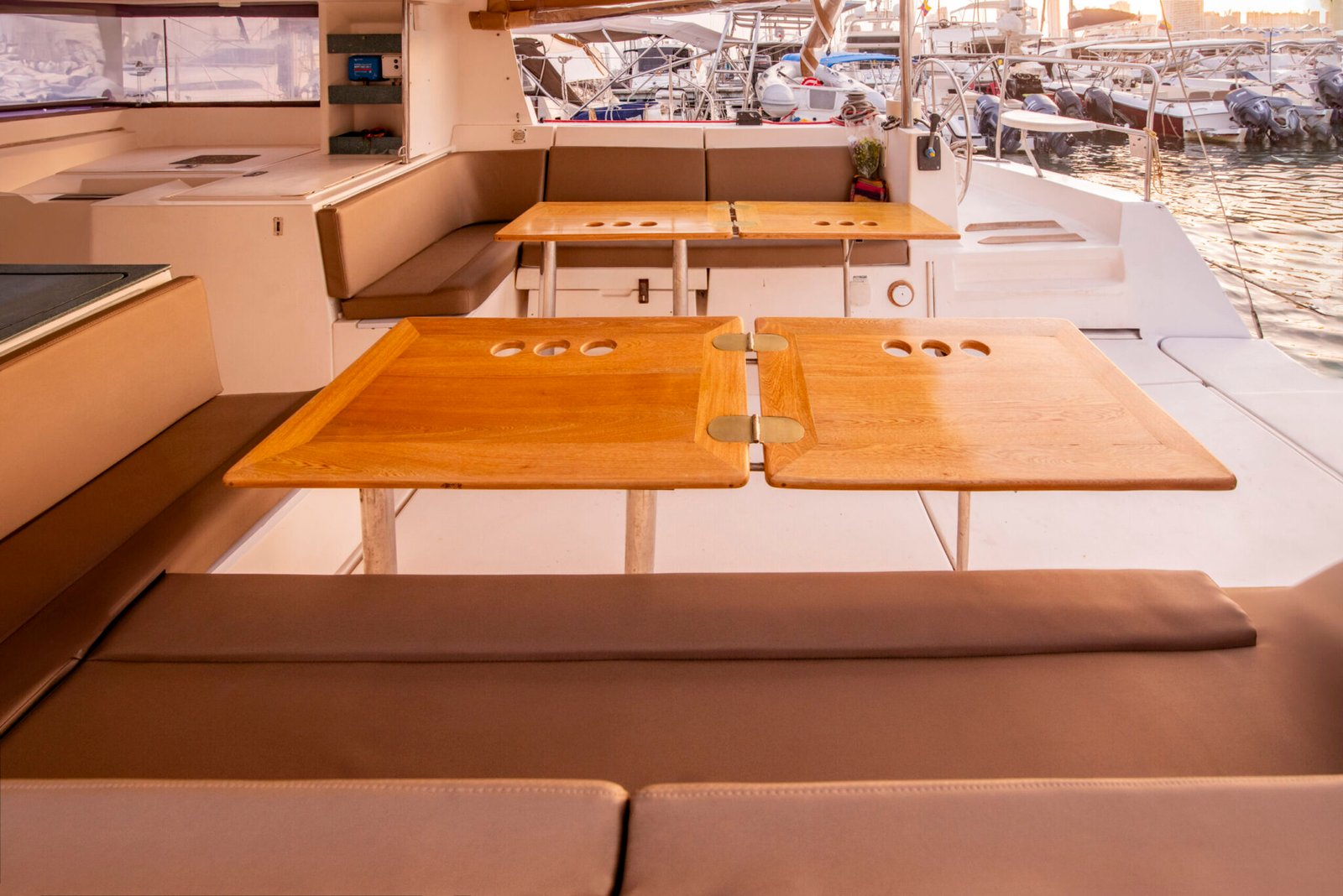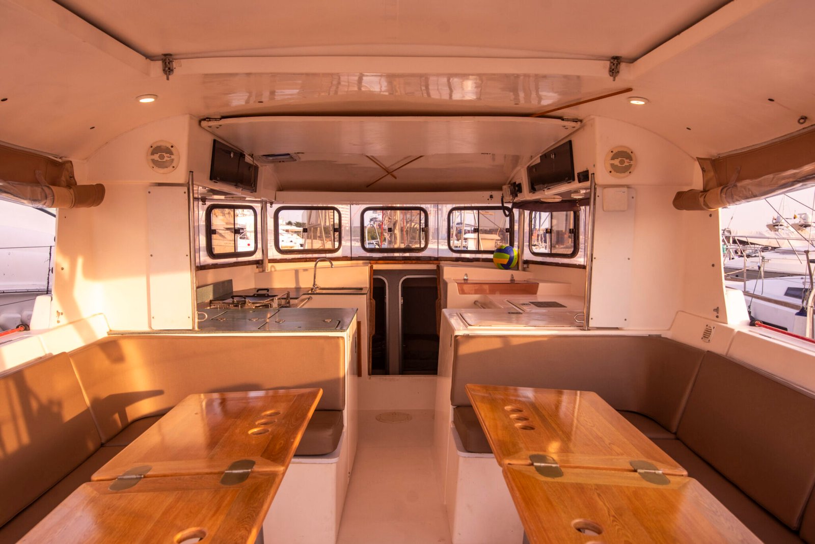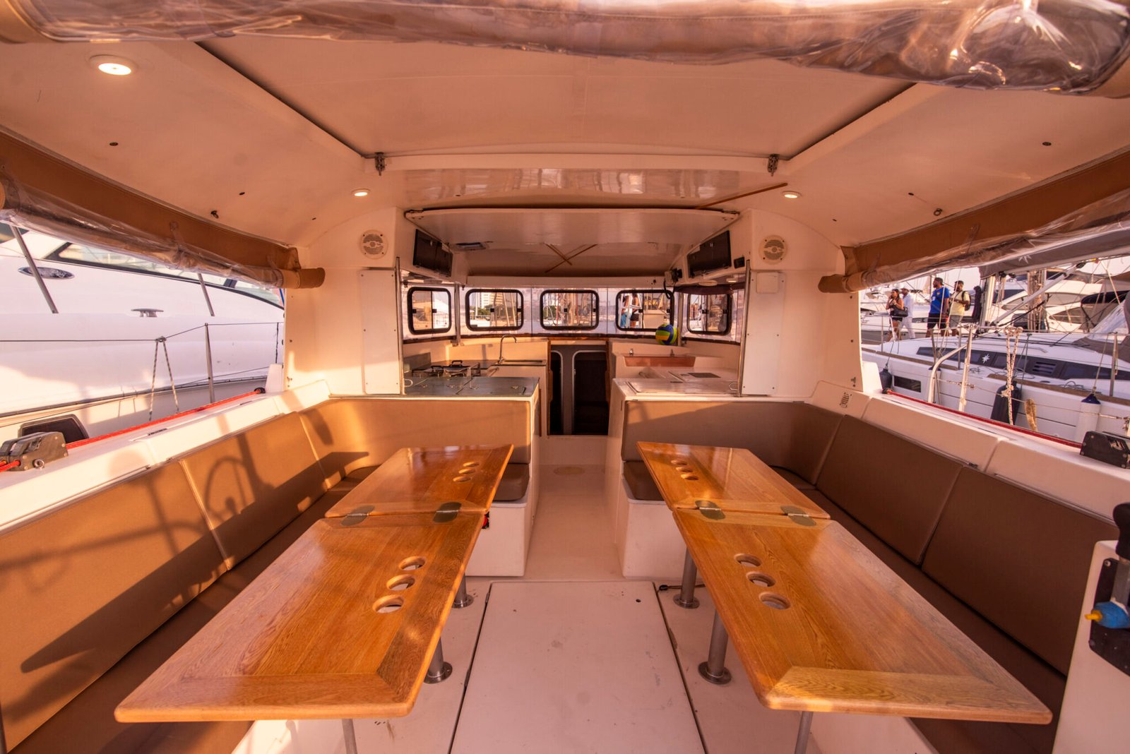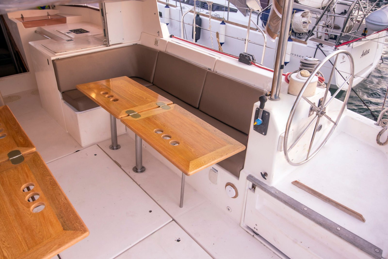 Gecko is a 43 foot Atoll, designed by Philippe Briand. It was built in 1999 by DUFOUR. Atoll sailboats have been specifically designed for charters in the Caribbean and have a similar style to a catamaran as their salon and kitchen are above deck. It takes up to 10 passengers distributed throughout four cabins. There are two private double cabins and two triple cabins with a double bed and one single bunk in each. There are two shared bathrooms. Gecko has ample shady lounging space in the salon and room to sunbathe on deck.