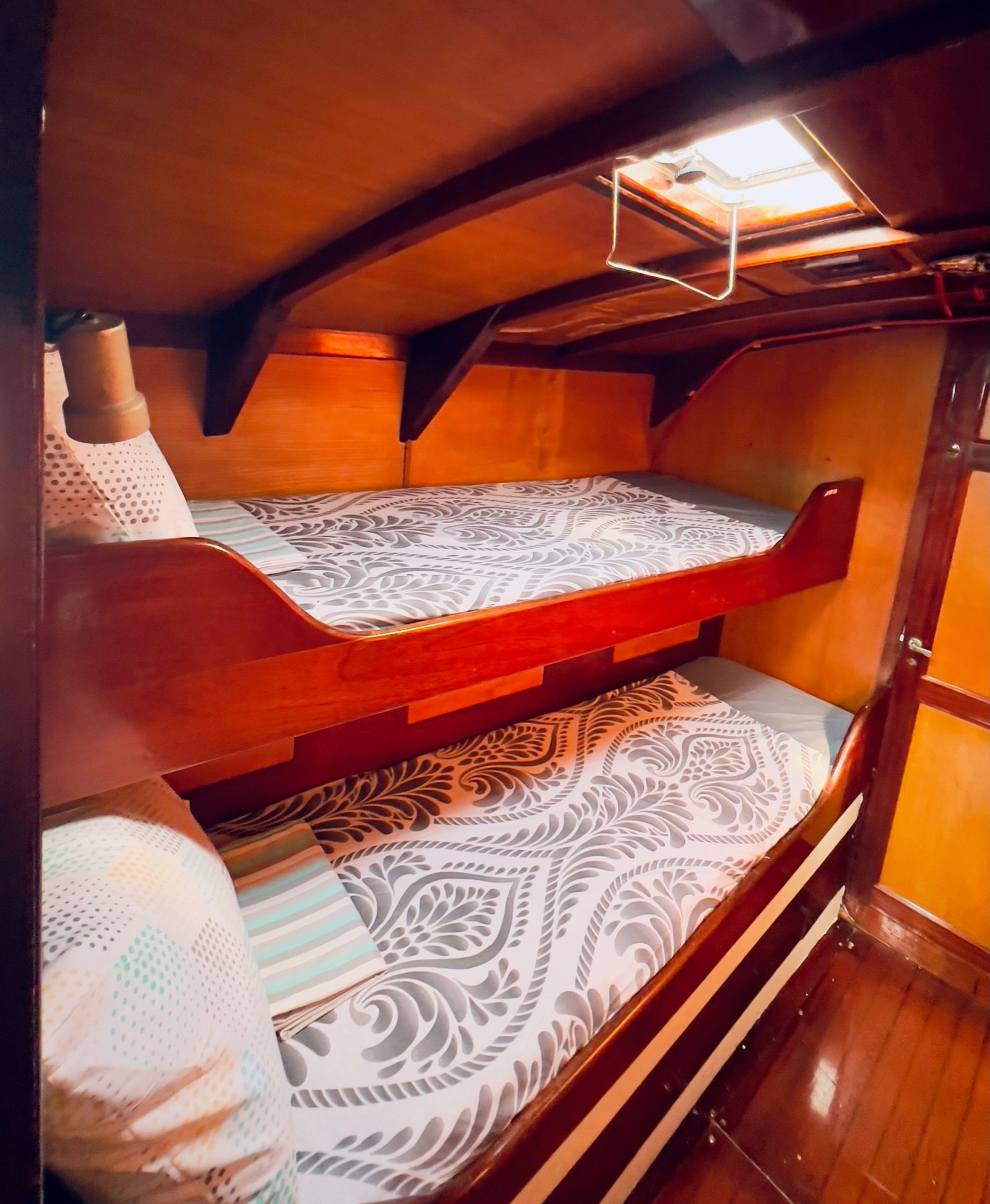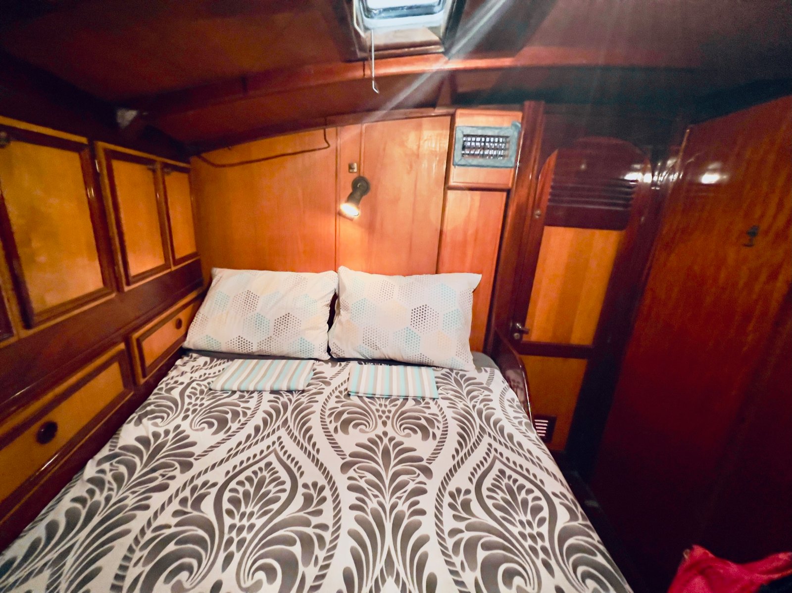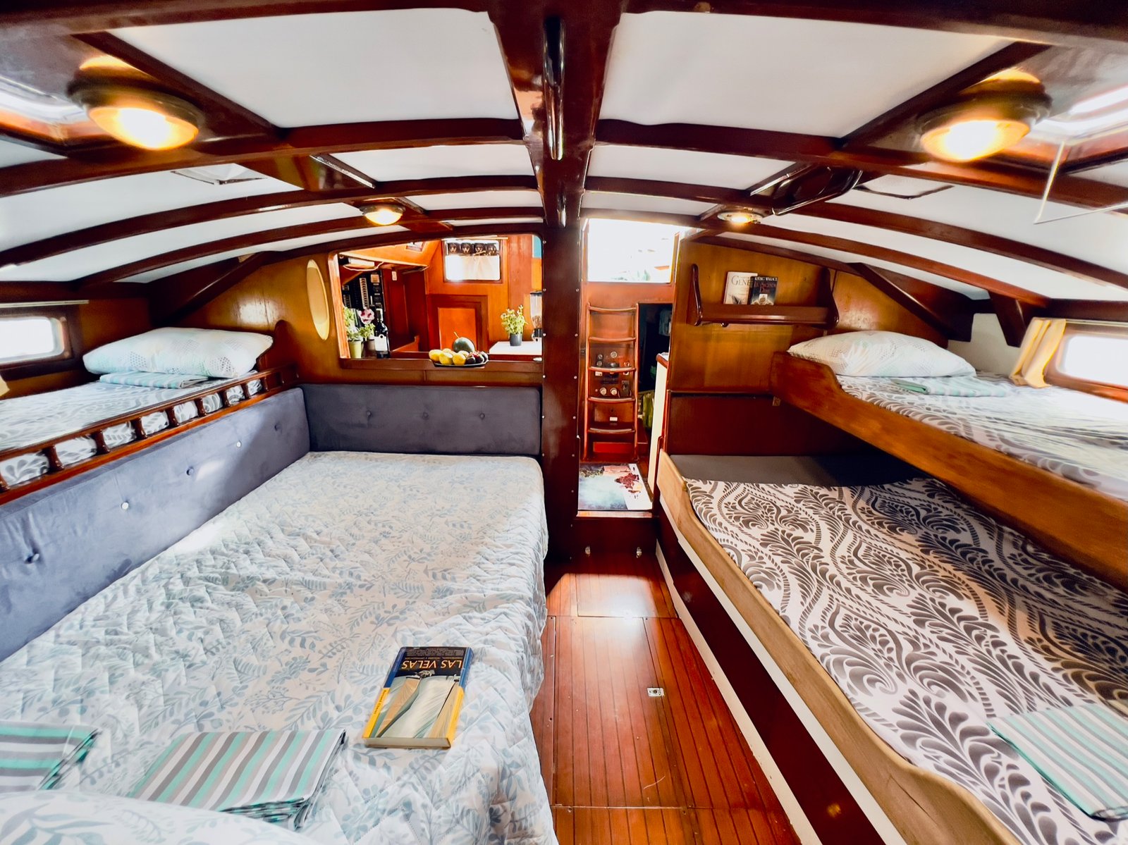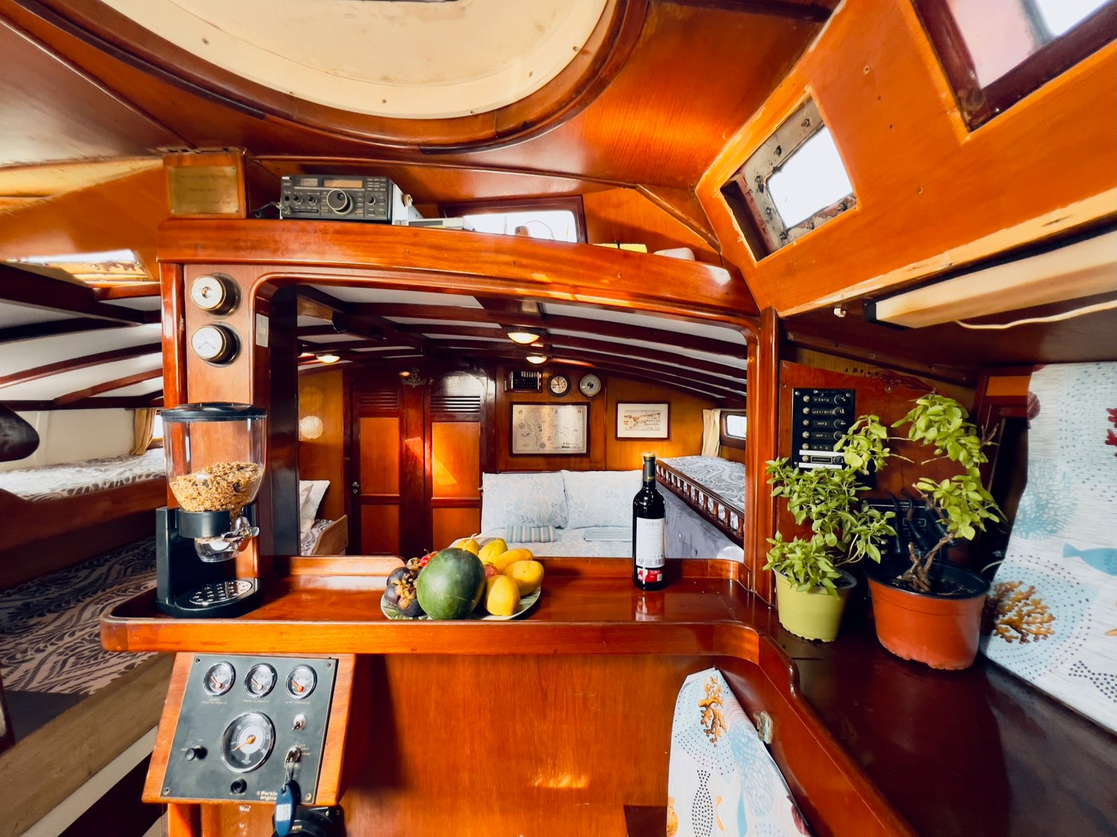 Kanihu is a 48 foot Damien II ketch sailboat, built by Astilleros Meta in Lyon France. It is a schooner-rigged steel boat with two masts and four sails, designed for circumnavigation. Kanihu has one private double cabin, two singles in the passageway, and two double beds, and two single beds in the main saloon. She has sailed around the world twice and is a beautiful classic sailboat.