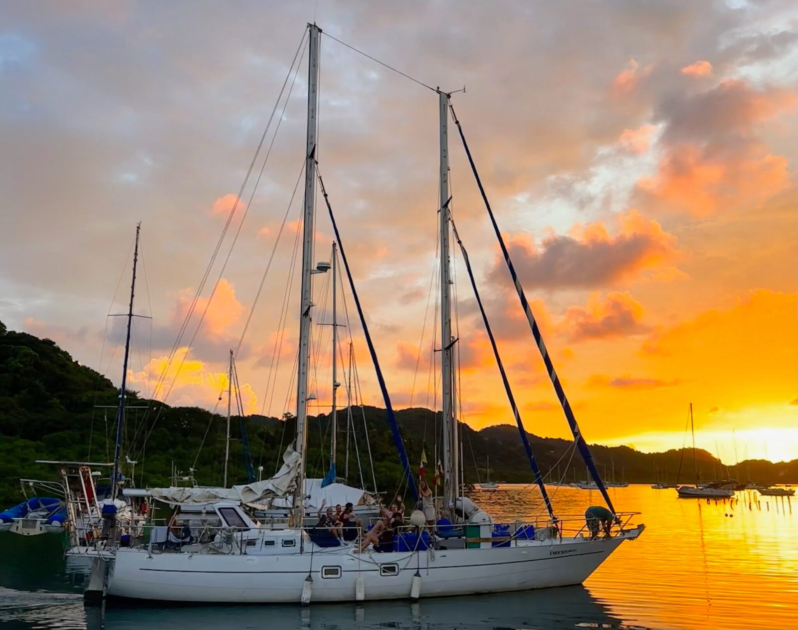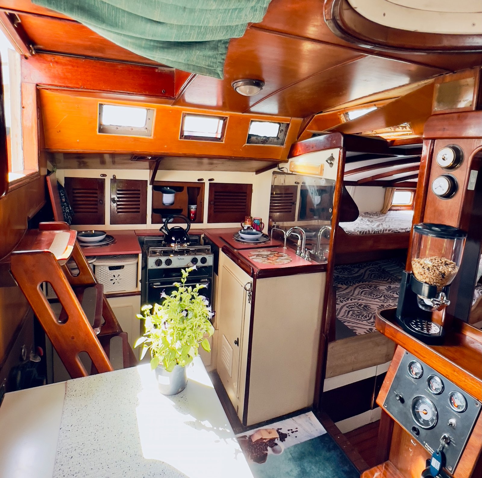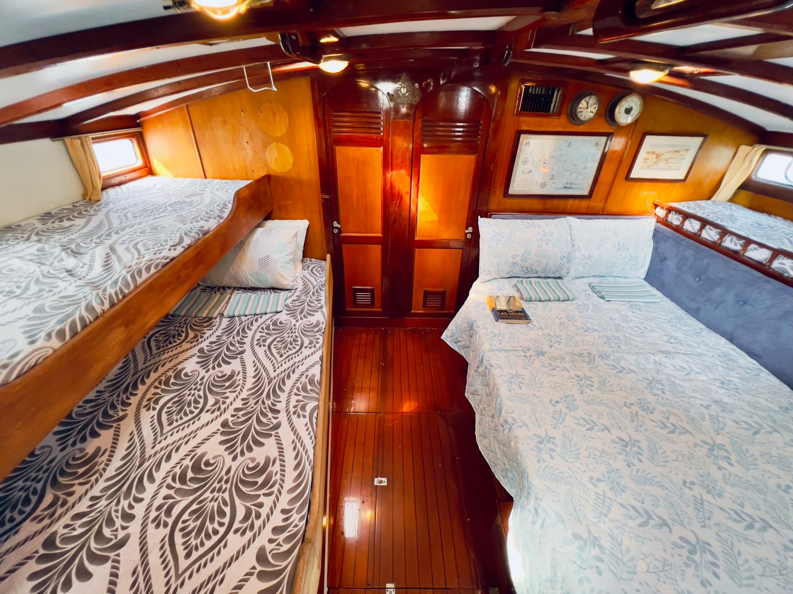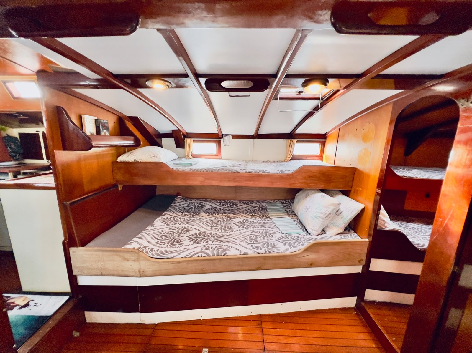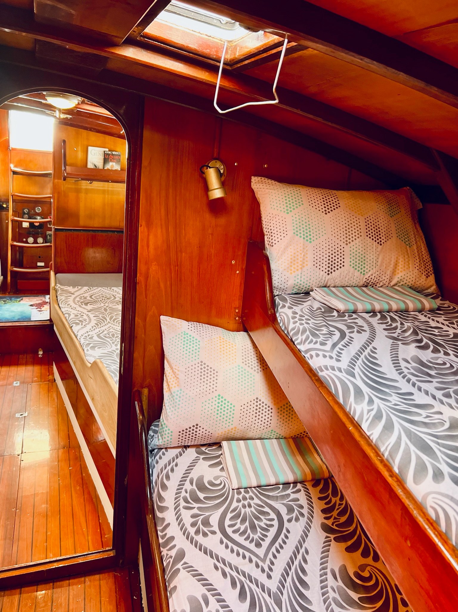 Kanihu is a 48 foot Damien II ketch sailboat, built by Astilleros Meta in Lyon France. It is a schooner-rigged steel boat with two masts and four sails, designed for circumnavigation. Kanihu has one private double cabin, two singles in the passageway, and two double beds, and two single beds in the main saloon. She has sailed around the world twice and is a beautiful classic sailboat.