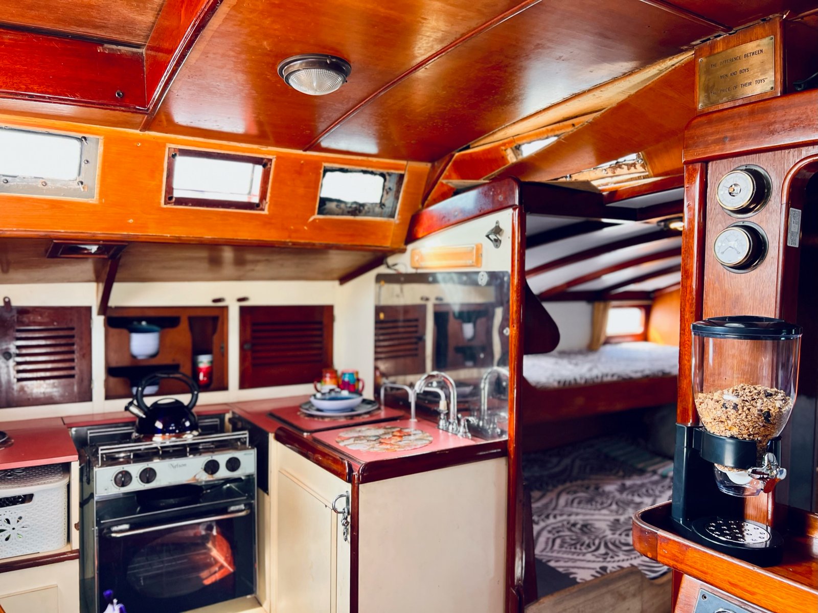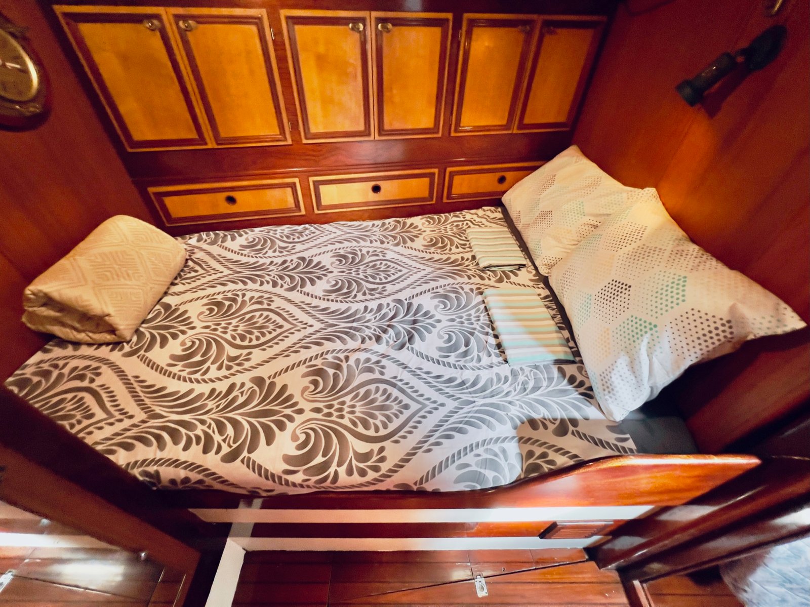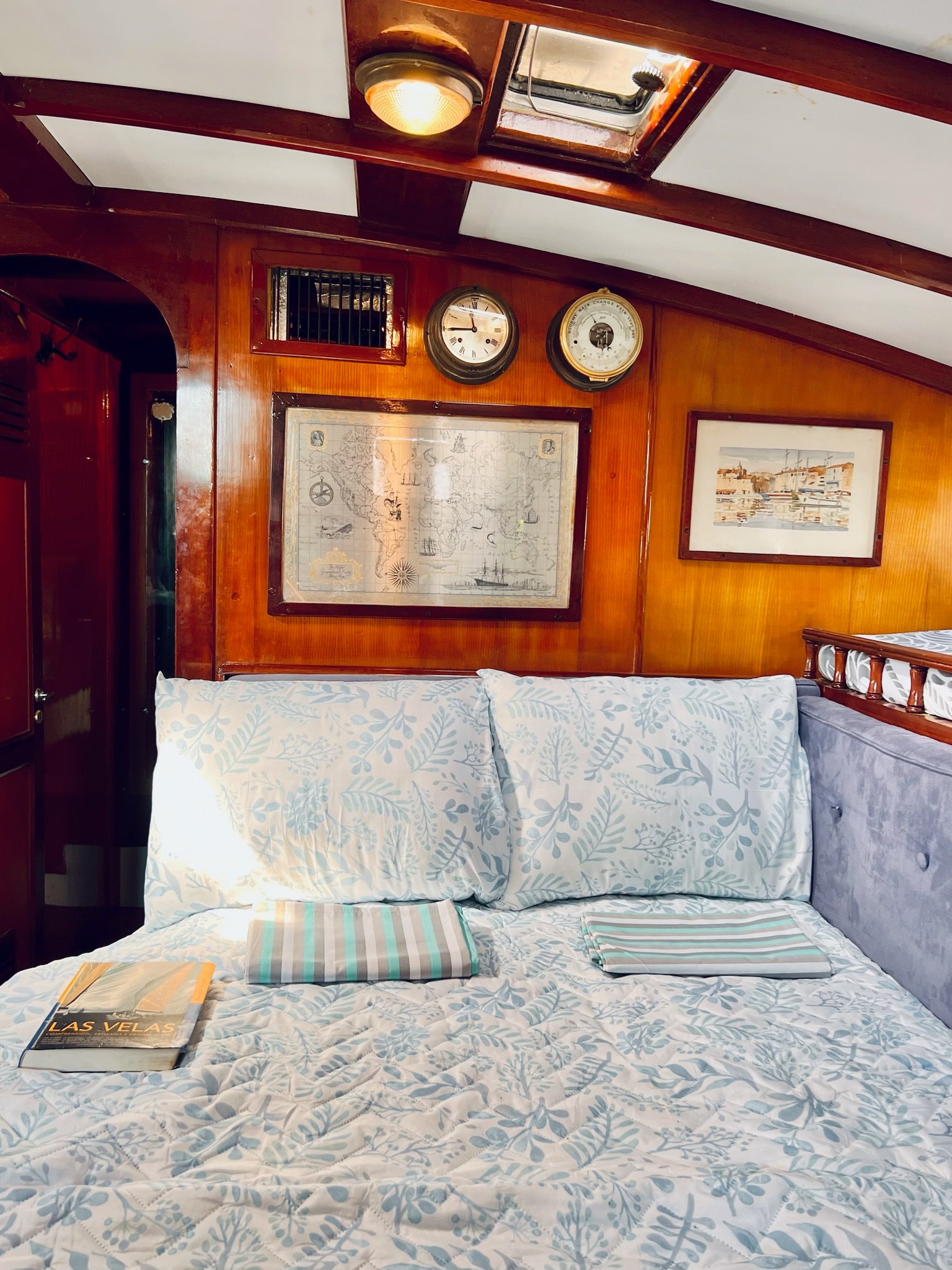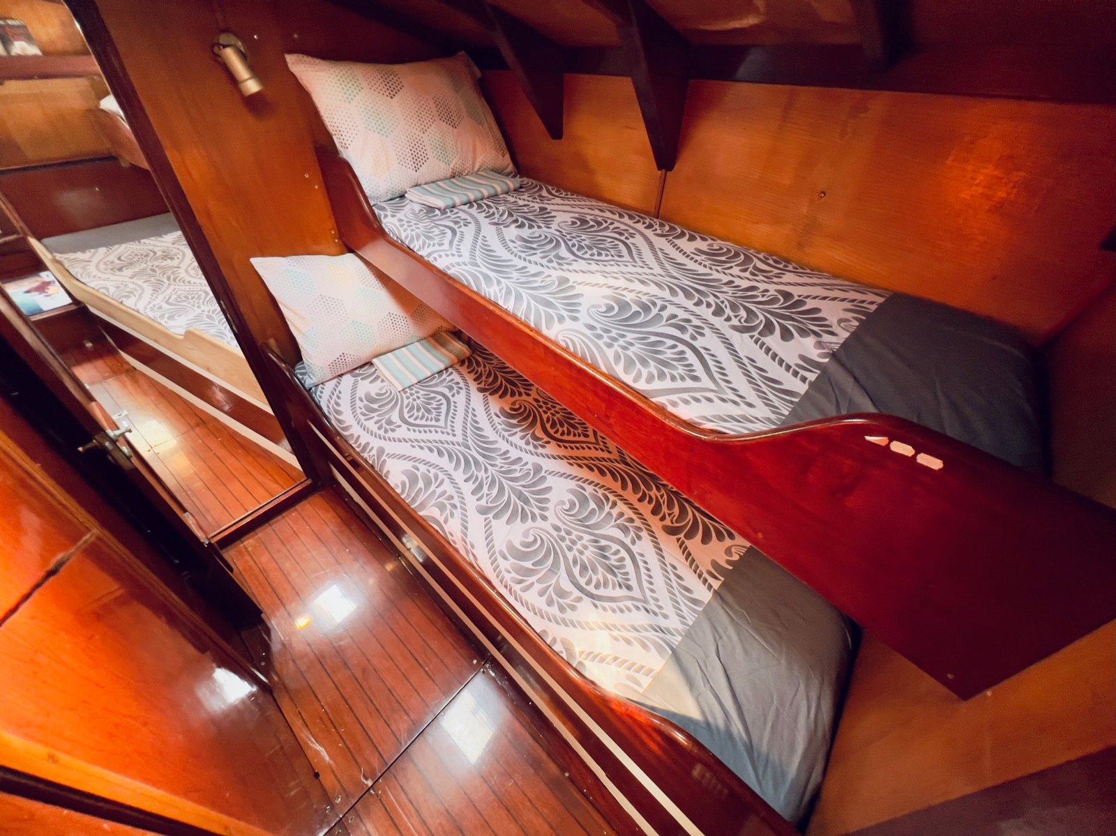 Kanihu is a 48 foot Damien II ketch sailboat, built by Astilleros Meta in Lyon France. It is a schooner-rigged steel boat with two masts and four sails, designed for circumnavigation. Kanihu has one private double cabin, two singles in the passageway, and two double beds, and two single beds in the main saloon. She has sailed around the world twice and is a beautiful classic sailboat.