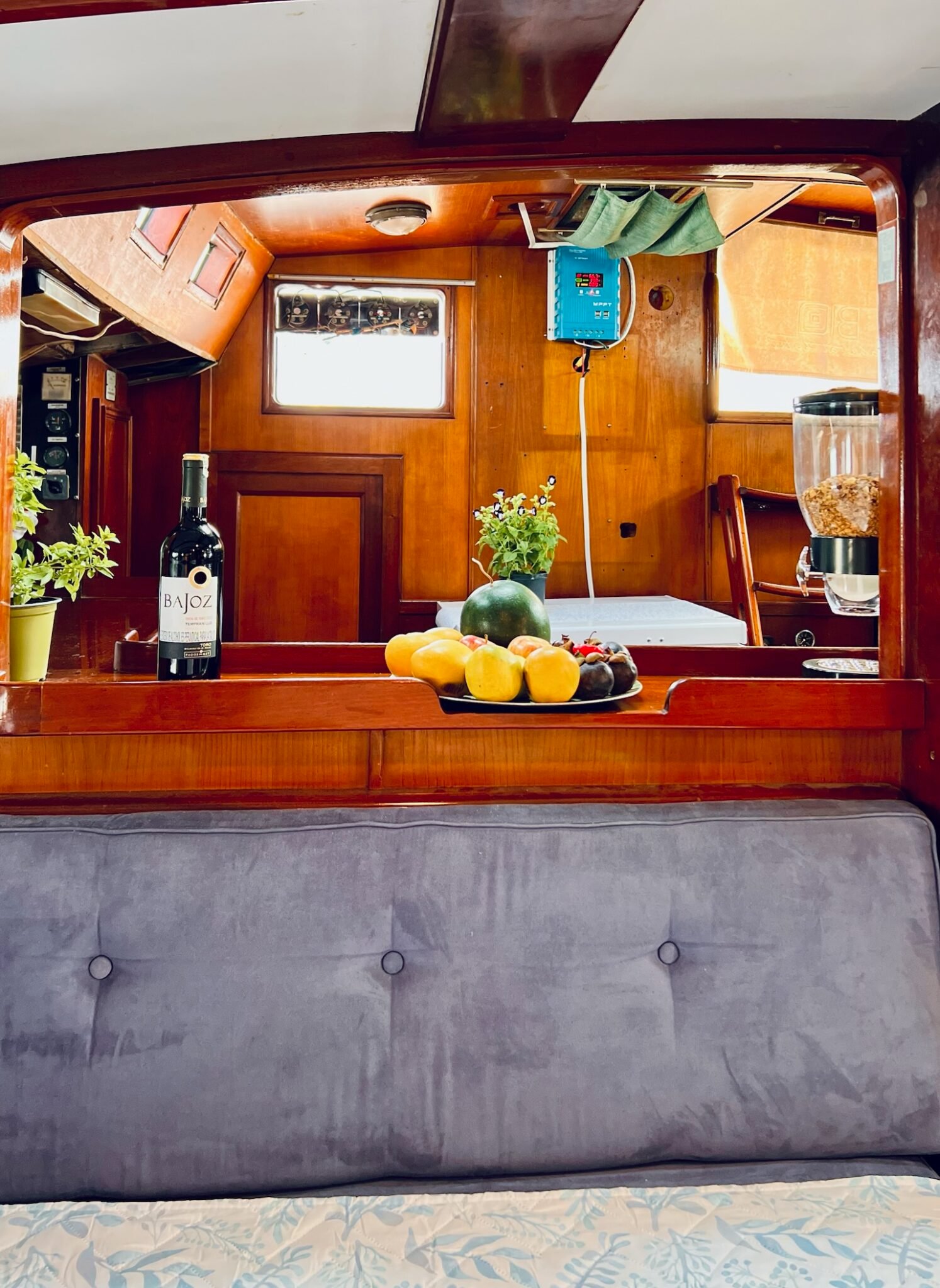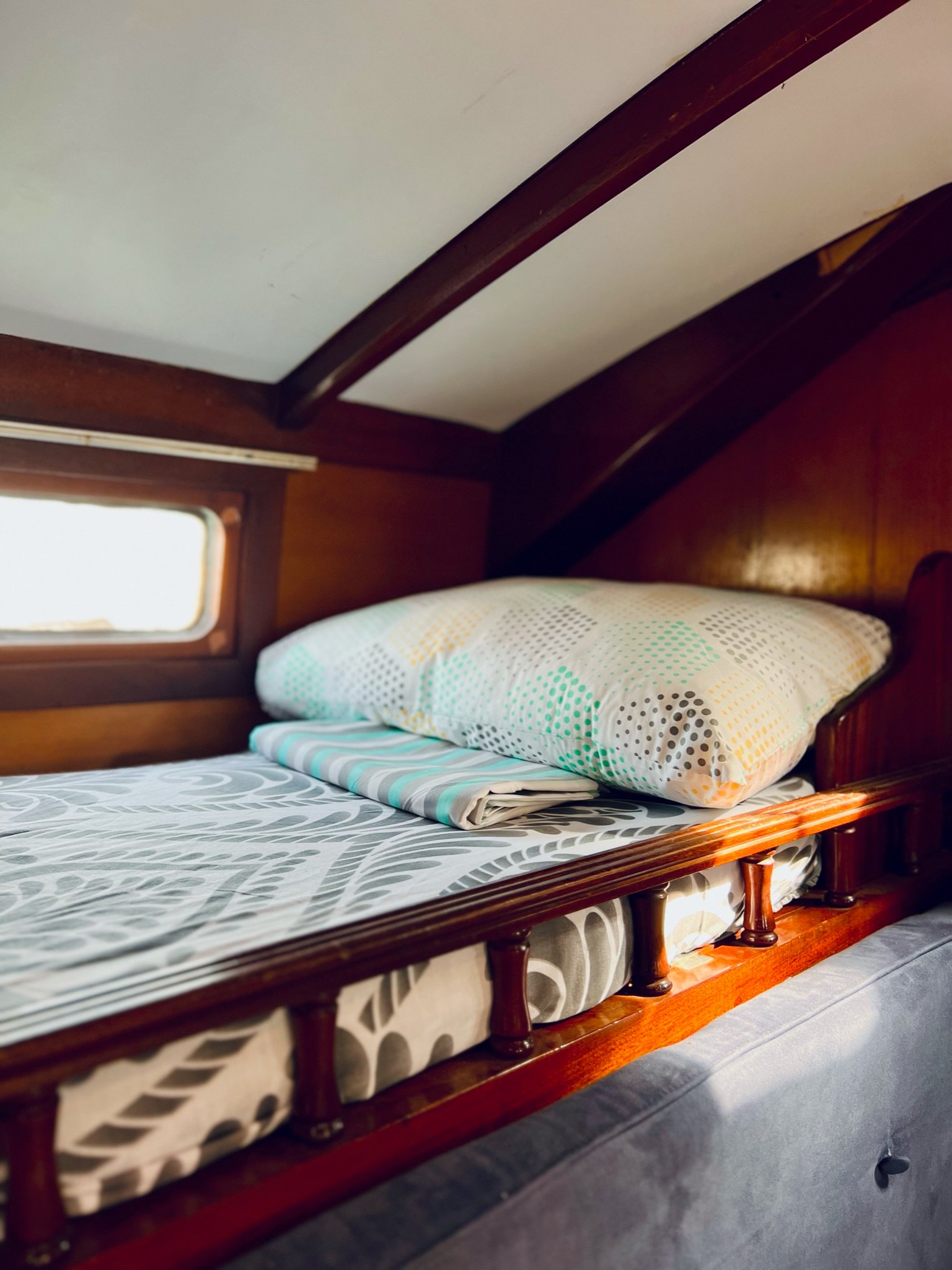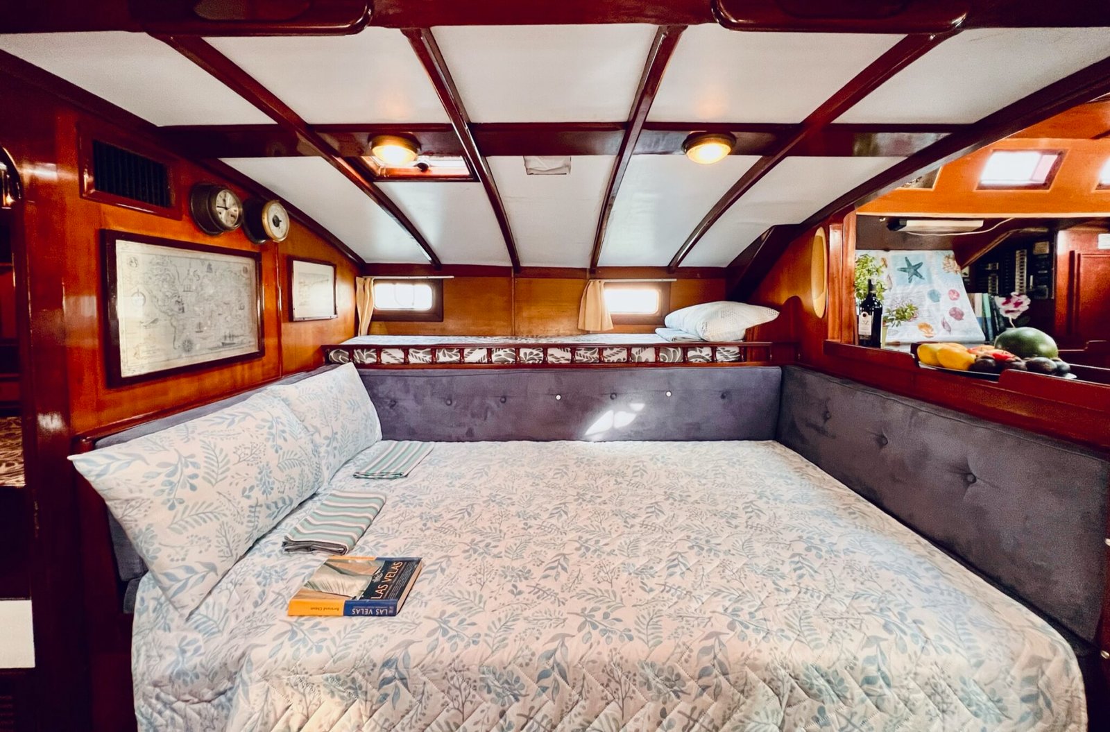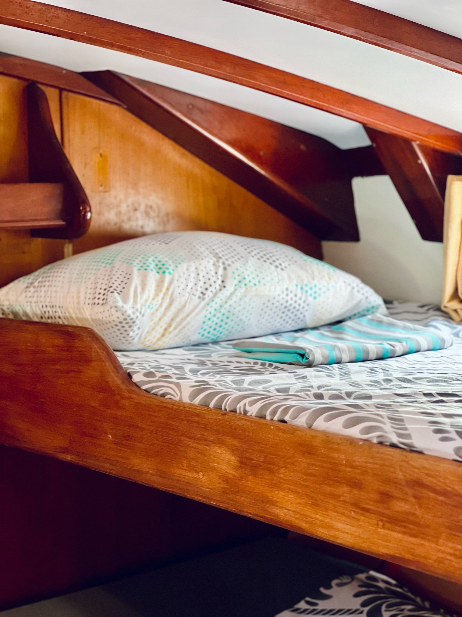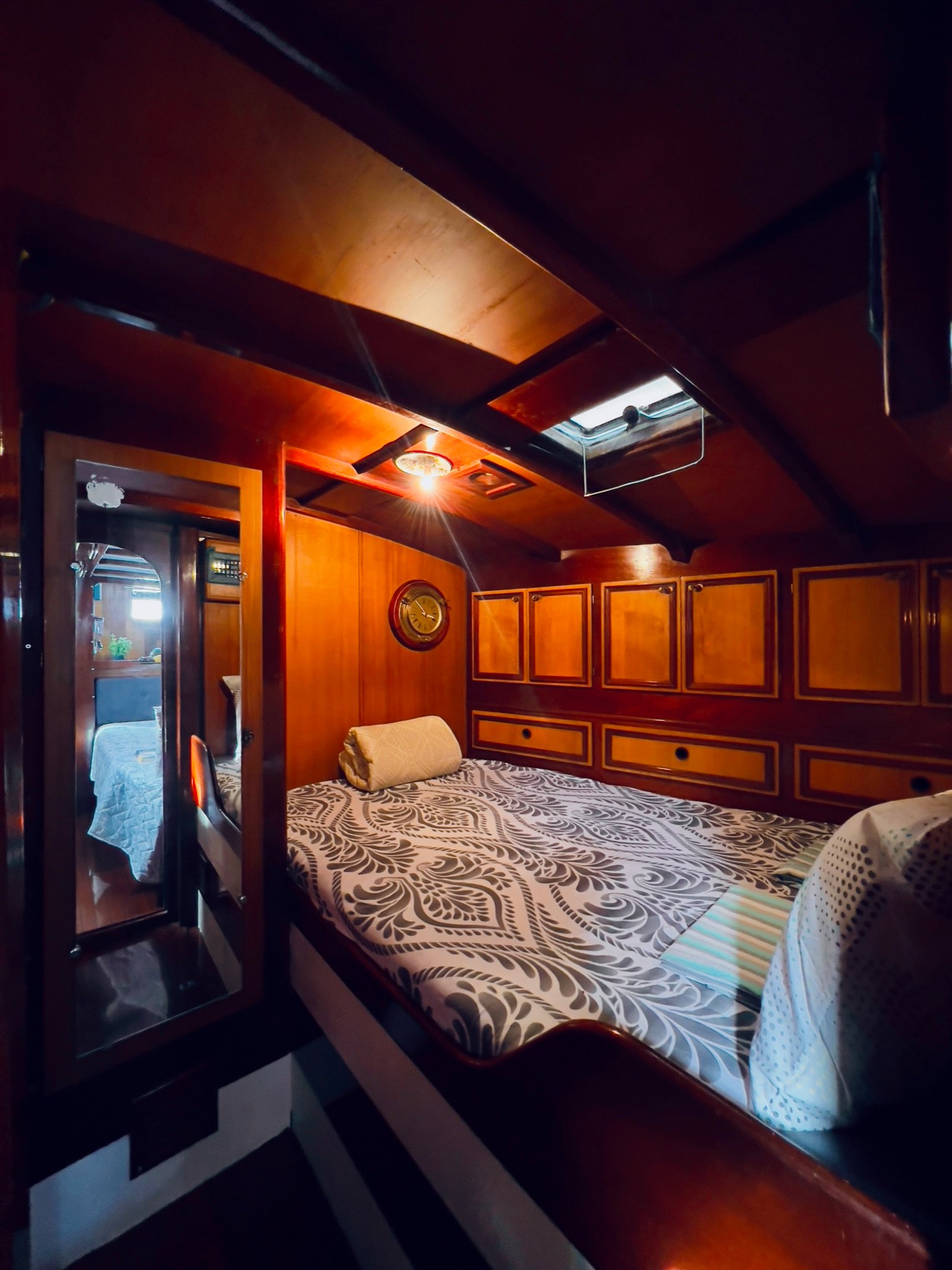 Kanihu is a 48 foot Damien II ketch sailboat, built by Astilleros Meta in Lyon France. It is a schooner-rigged steel boat with two masts and four sails, designed for circumnavigation. Kanihu has one private double cabin, two singles in the passageway, and two double beds, and two single beds in the main saloon. She has sailed around the world twice and is a beautiful classic sailboat.