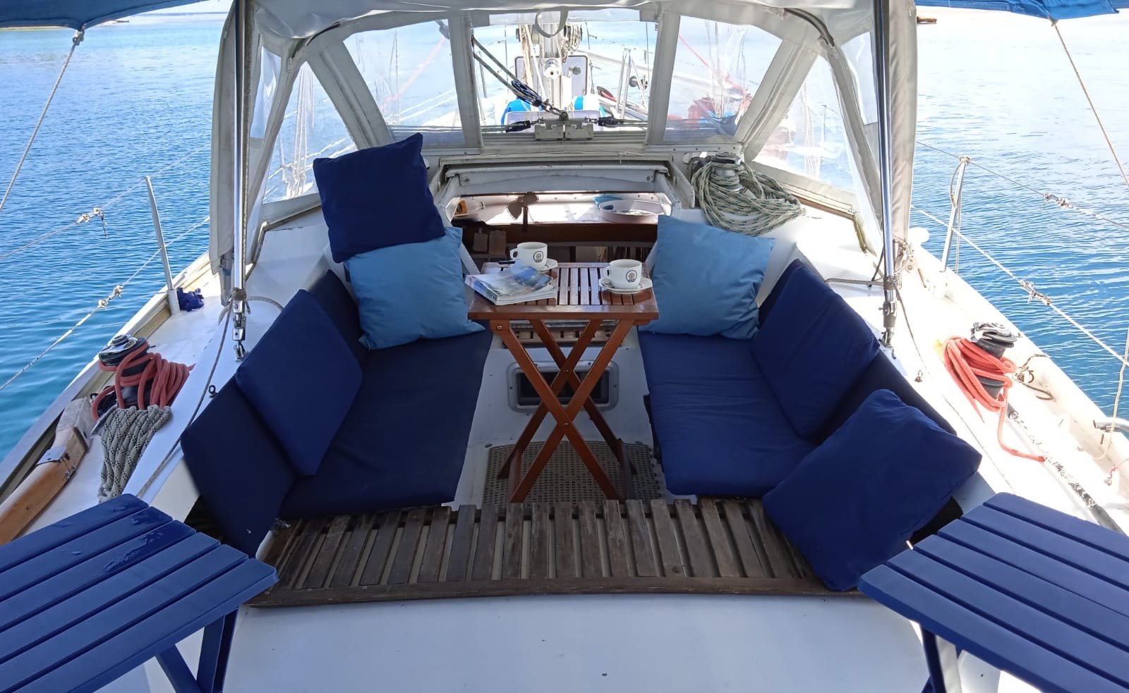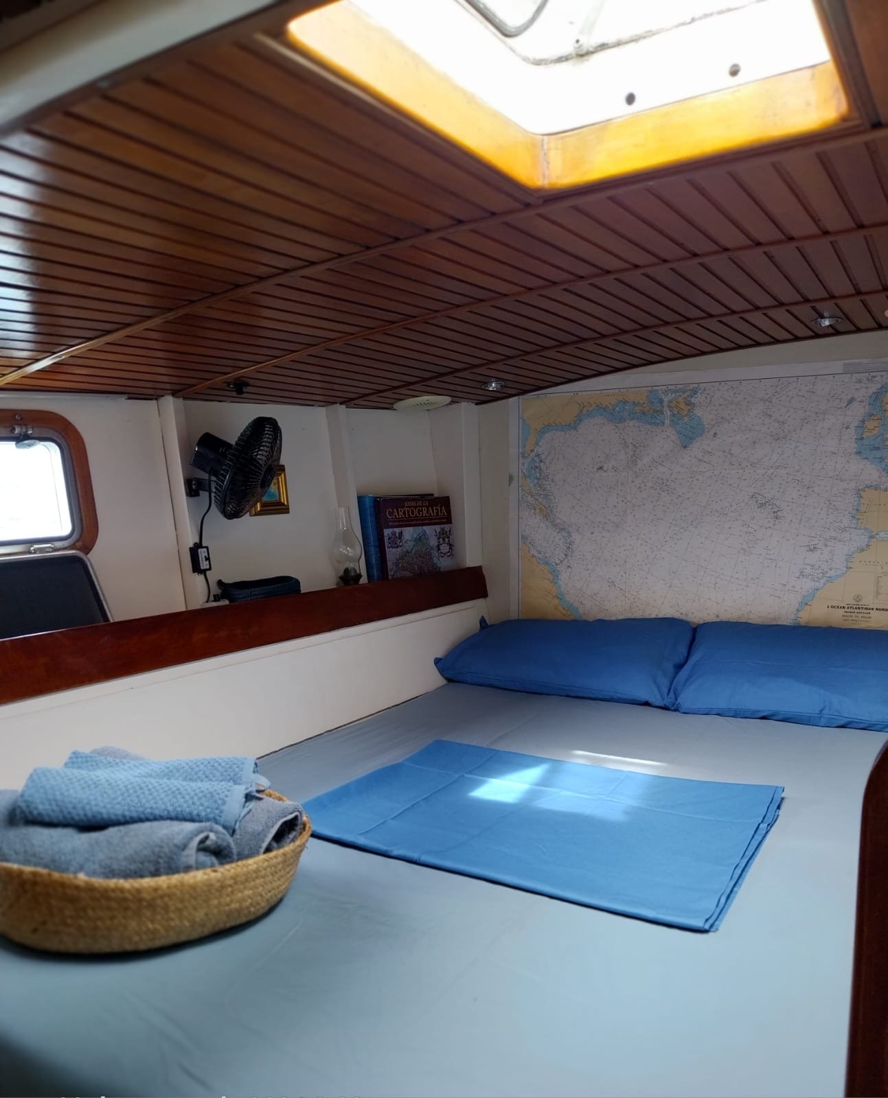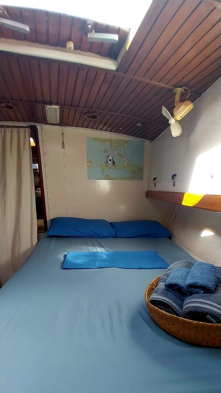 Tintamare is a 41 foot Beaujolais sailboat with an aluminum hull and a canting keel and was designed by the renowned French naval architect, Philippe Harlé. It accommodates up to 5 guests in two comfortable double cabins. There is also an additional single bed in the saloon area. Enjoy delicious freshly prepared meals, natural juices, and moderate alcoholic beverages, all served by a welcoming crew that includes a captain and a sailor/cook. Onboard amenities include fans in each cabin, a barbecue, linens, towels, and everything you need to have fun on the water! There are two individual kayaks, a double paddleboard, and snorkeling gear and Starlink. Certified yoga sessions are also available onboard for a truly relaxing experience. With comprehensive safety gear and a cozy, personalized atmosphere, Tintamare offers a perfect blend of adventure and comfort at sea.