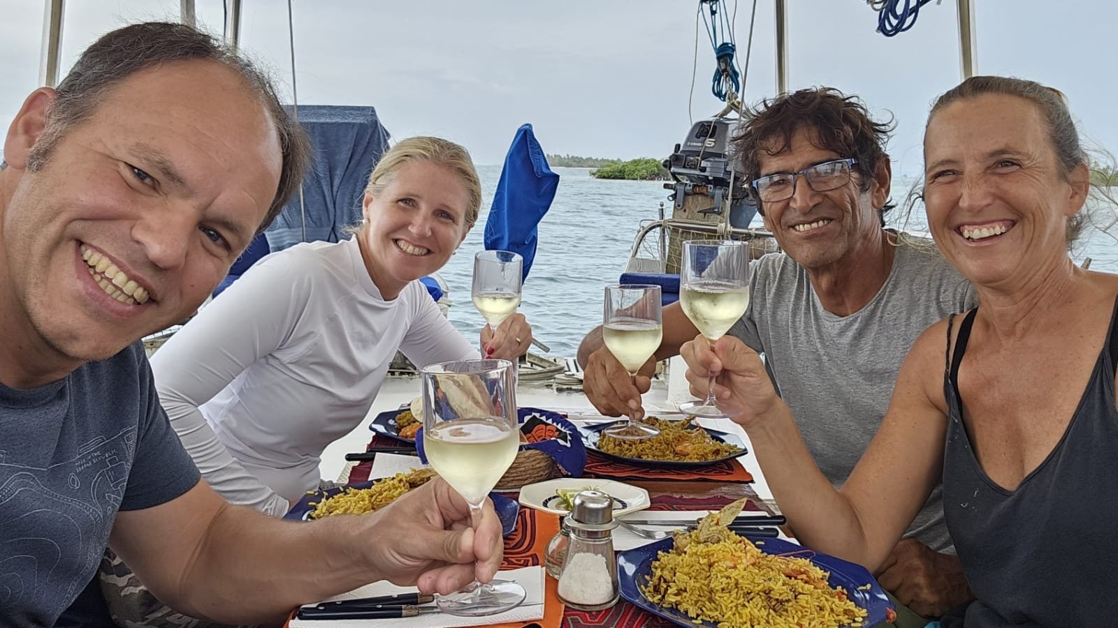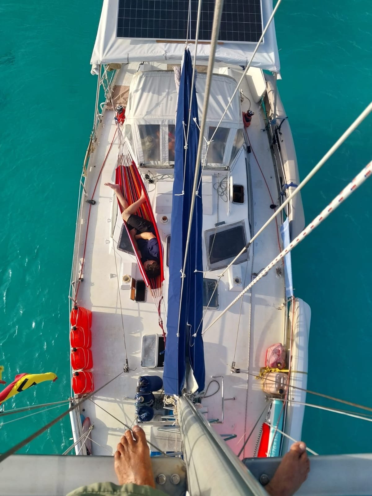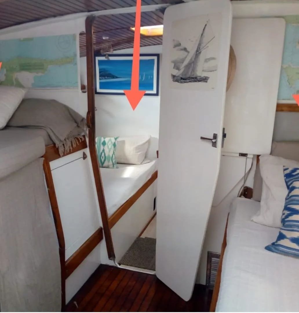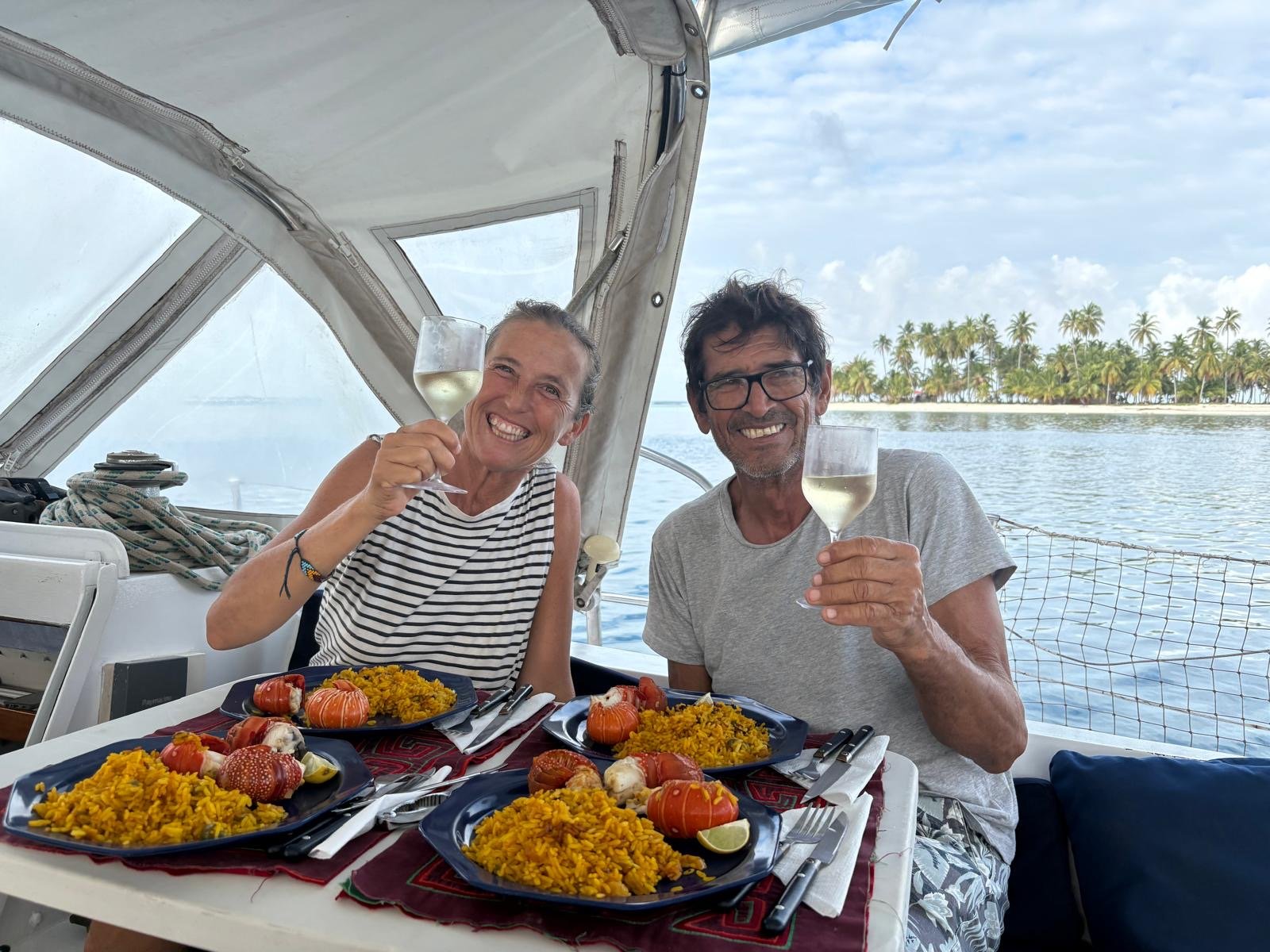 Tintamare is a 41 foot Beaujolais sailboat with an aluminum hull and a canting keel and was designed by the renowned French naval architect, Philippe Harlé. It accommodates up to 5 guests in two comfortable double cabins. There is also an additional single bed in the saloon area. Enjoy delicious freshly prepared meals, natural juices, and moderate alcoholic beverages, all served by a welcoming crew that includes a captain and a sailor/cook. Onboard amenities include fans in each cabin, a barbecue, linens, towels, and everything you need to have fun on the water! There are two individual kayaks, a double paddleboard, and snorkeling gear and Starlink. Certified yoga sessions are also available onboard for a truly relaxing experience. With comprehensive safety gear and a cozy, personalized atmosphere, Tintamare offers a perfect blend of adventure and comfort at sea.