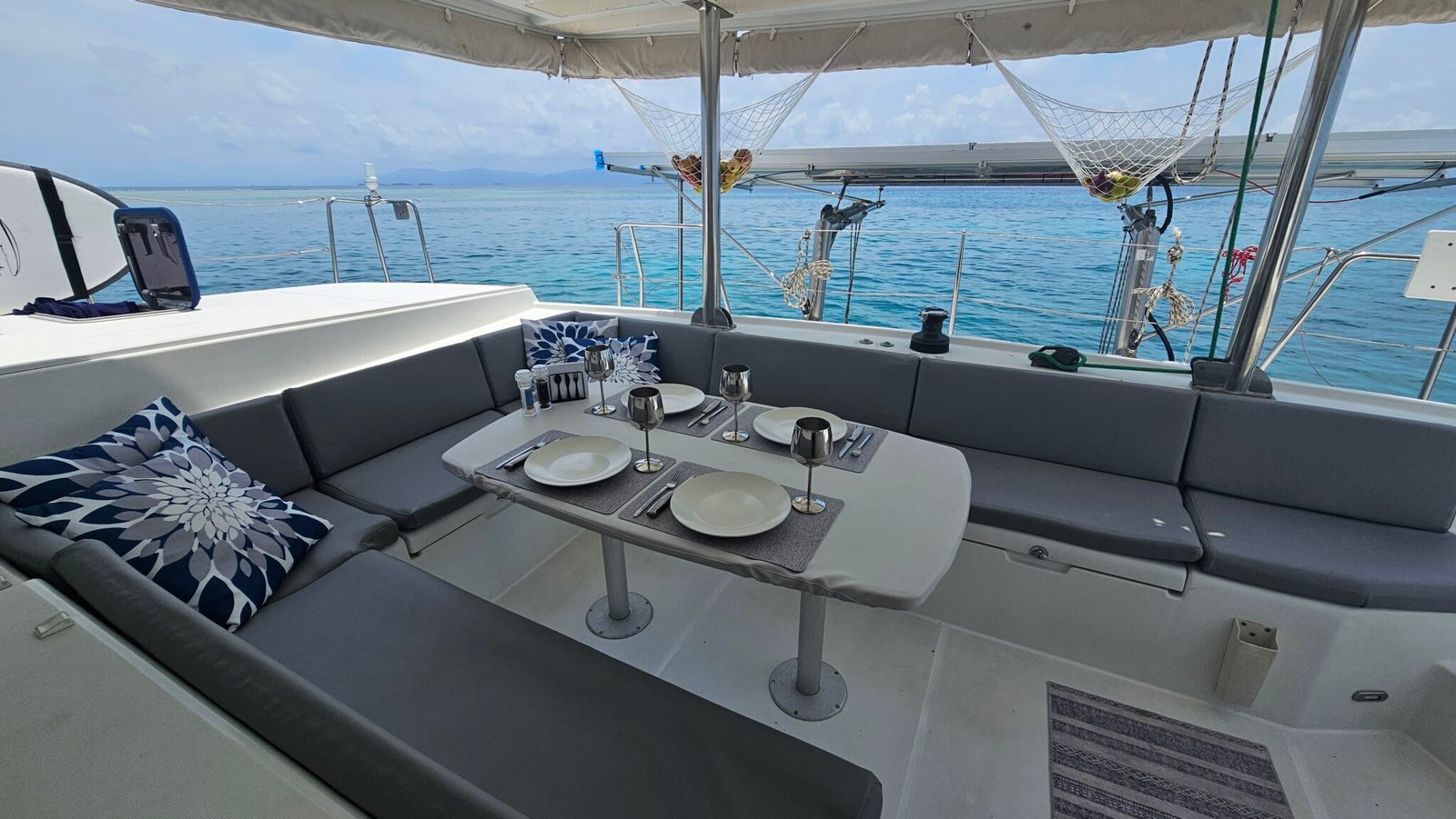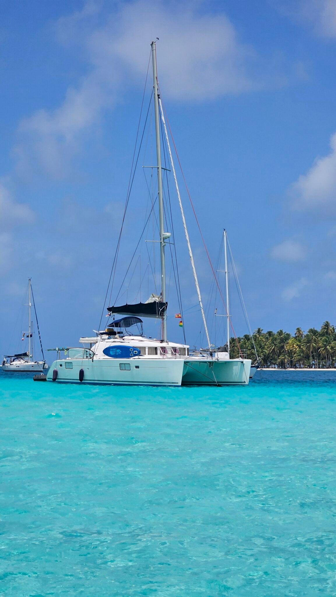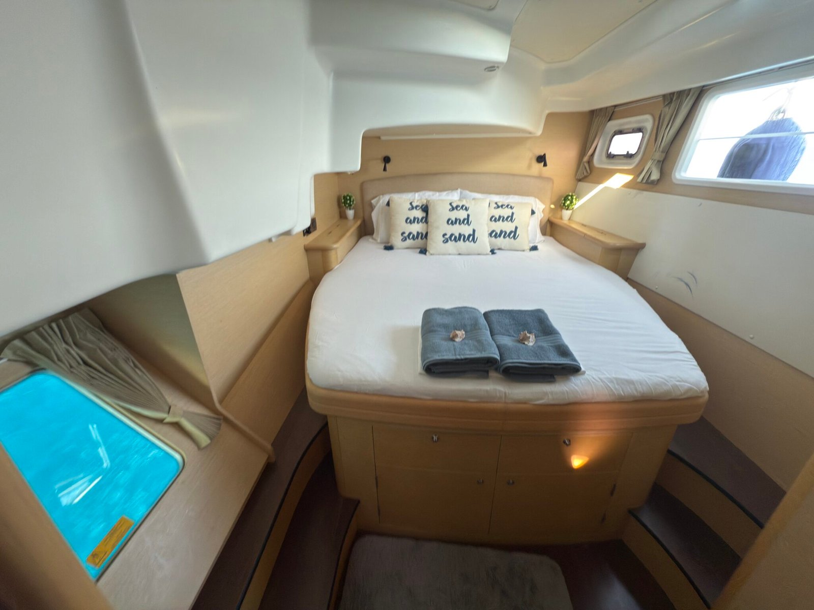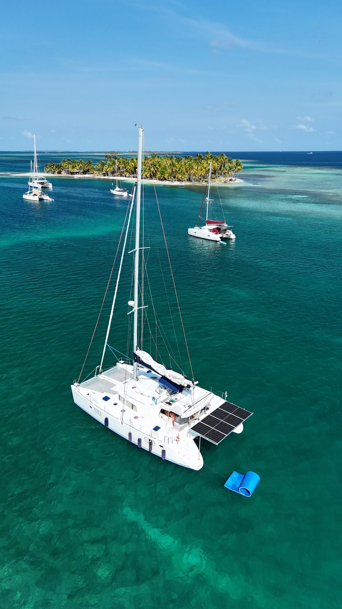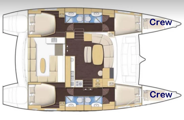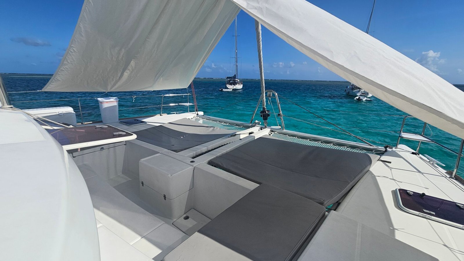 Yoli is a Lagoon 44-foot catamaran designed for comfort and space, with four cabins: two aft cabins with queen beds and private bathrooms, one forward cabin with a double bed and full bathroom, and another forward cabin with a double bed and a bathroom that includes a sink and shower (no toilet). The boat features a panoramic indoor saloon and a large shaded outdoor lounge area. Onboard amenities include Starlink Wi-Fi, bath and beach towels, snorkeling equipment, paddleboards, and a floating mat.