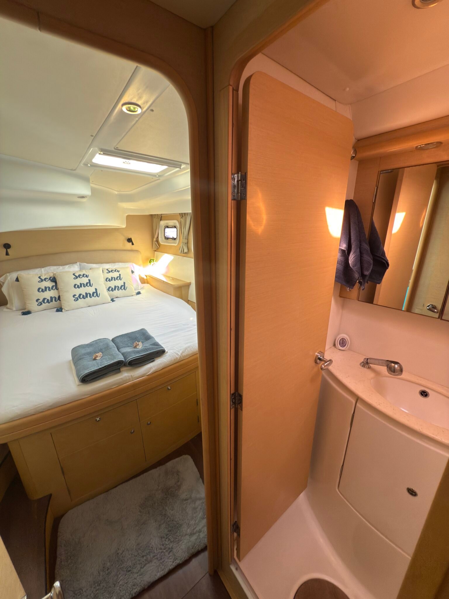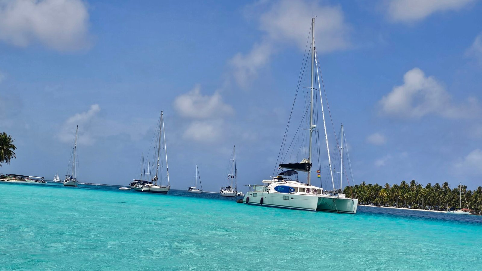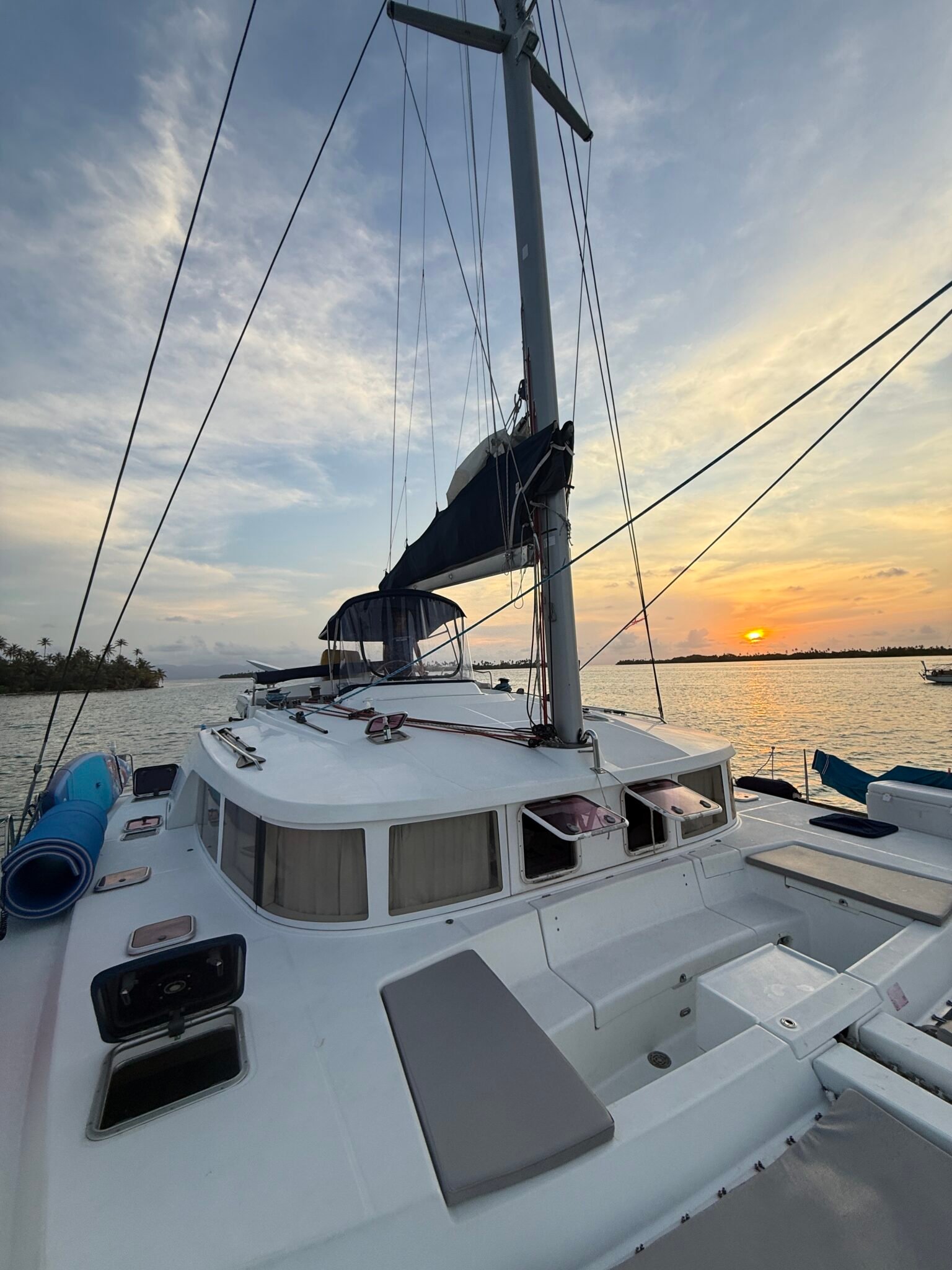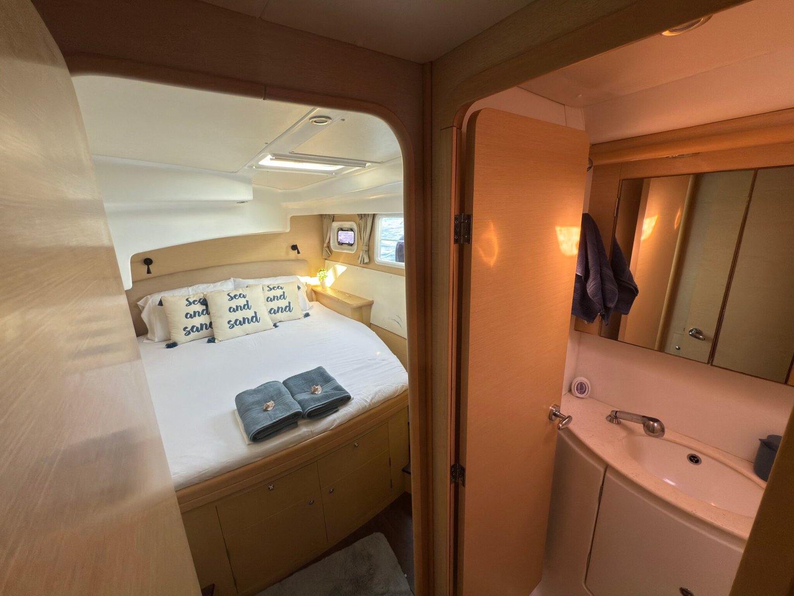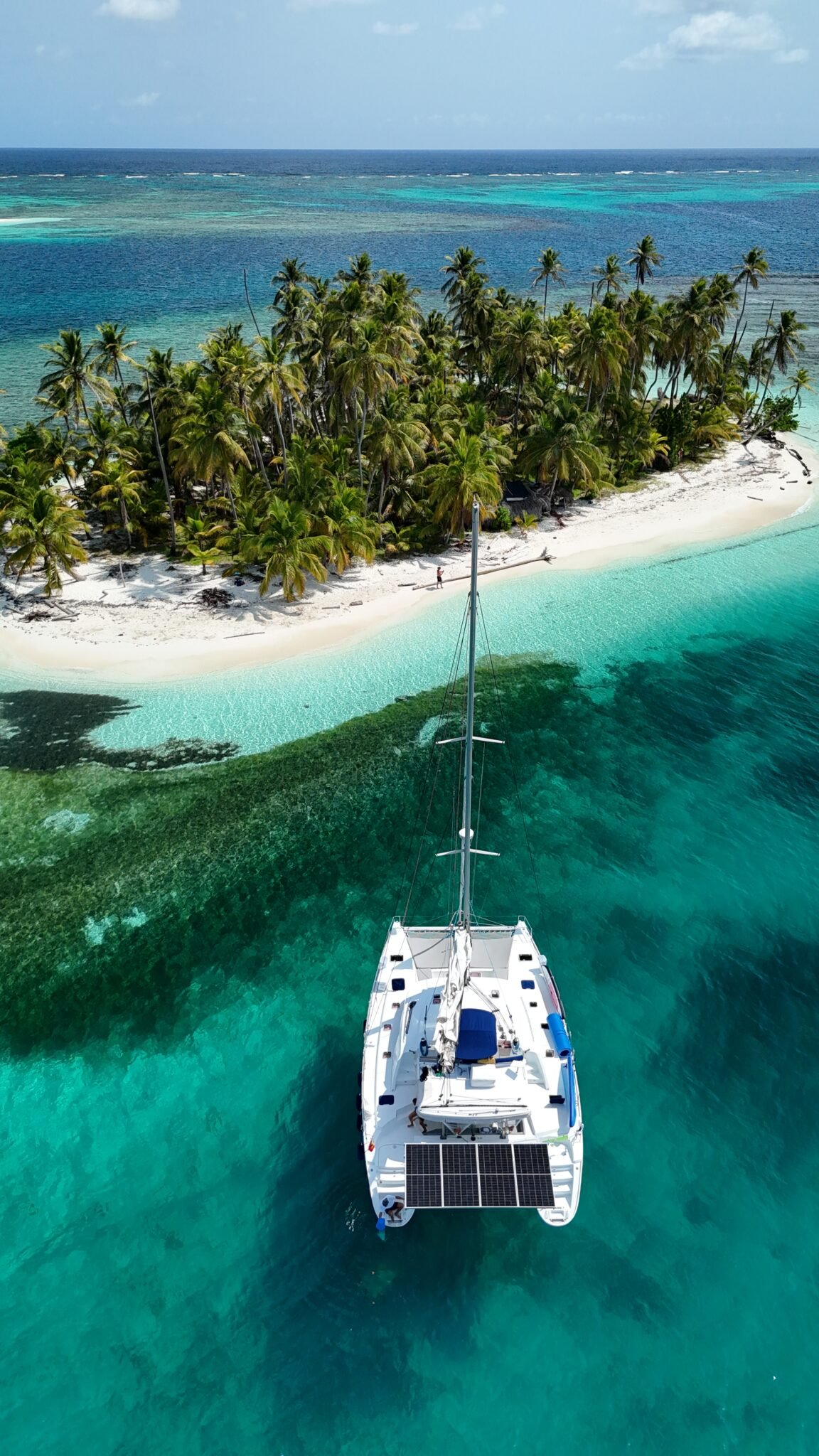 Yoli is a Lagoon 44-foot catamaran designed for comfort and space, with four cabins: two aft cabins with queen beds and private bathrooms, one forward cabin with a double bed and full bathroom, and another forward cabin with a double bed and a bathroom that includes a sink and shower (no toilet). The boat features a panoramic indoor saloon and a large shaded outdoor lounge area. Onboard amenities include Starlink Wi-Fi, bath and beach towels, snorkeling equipment, paddleboards, and a floating mat.