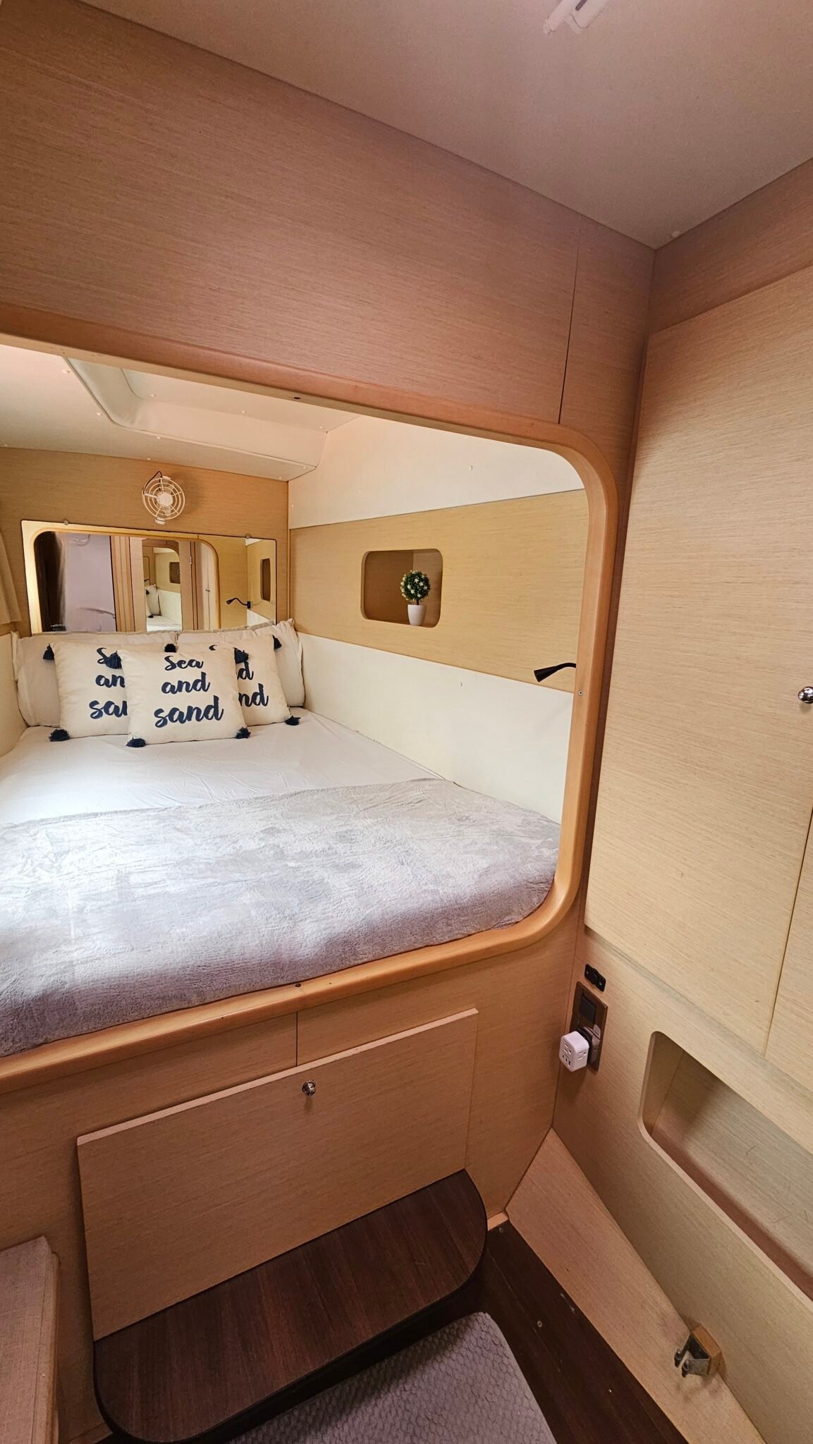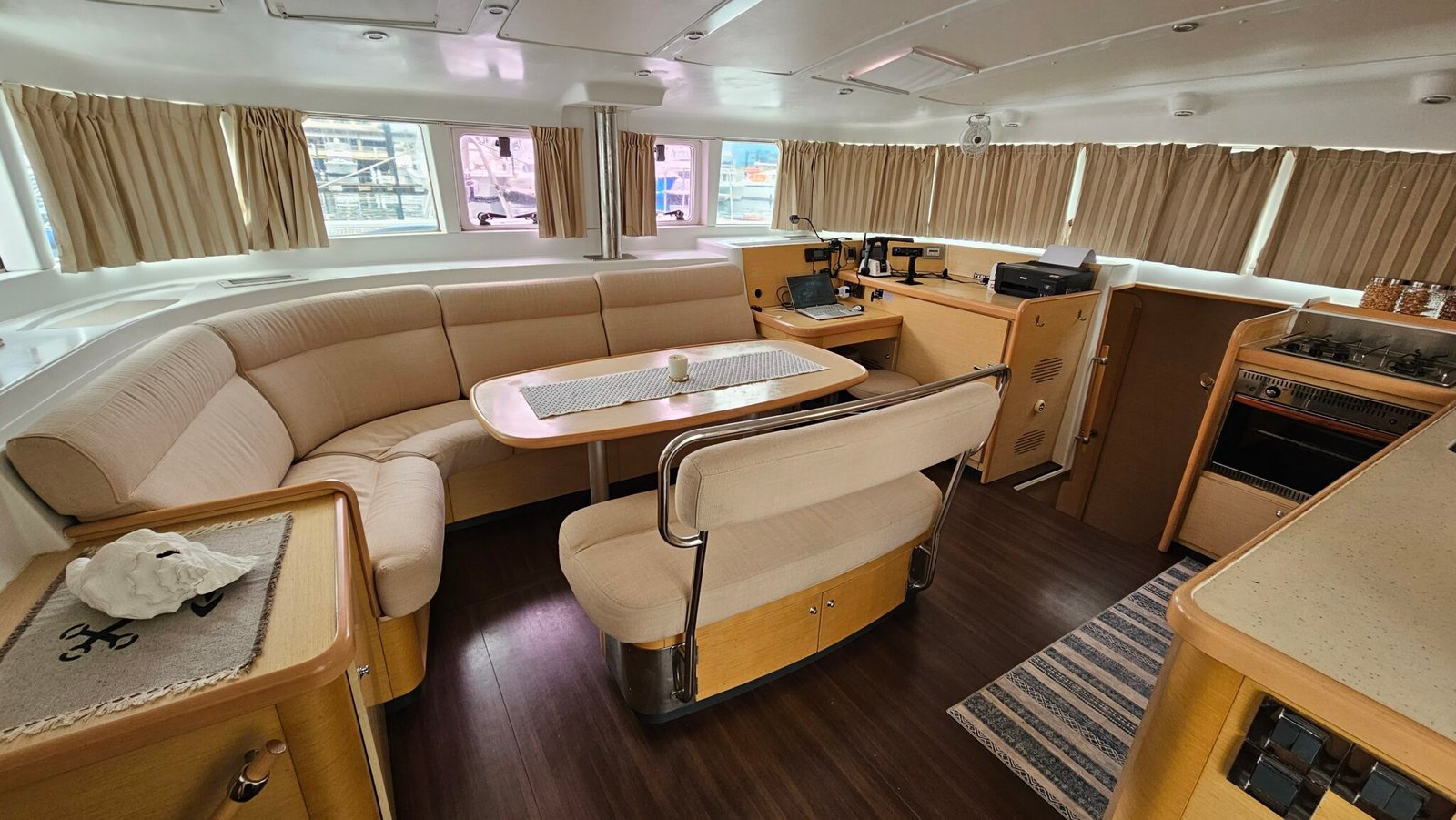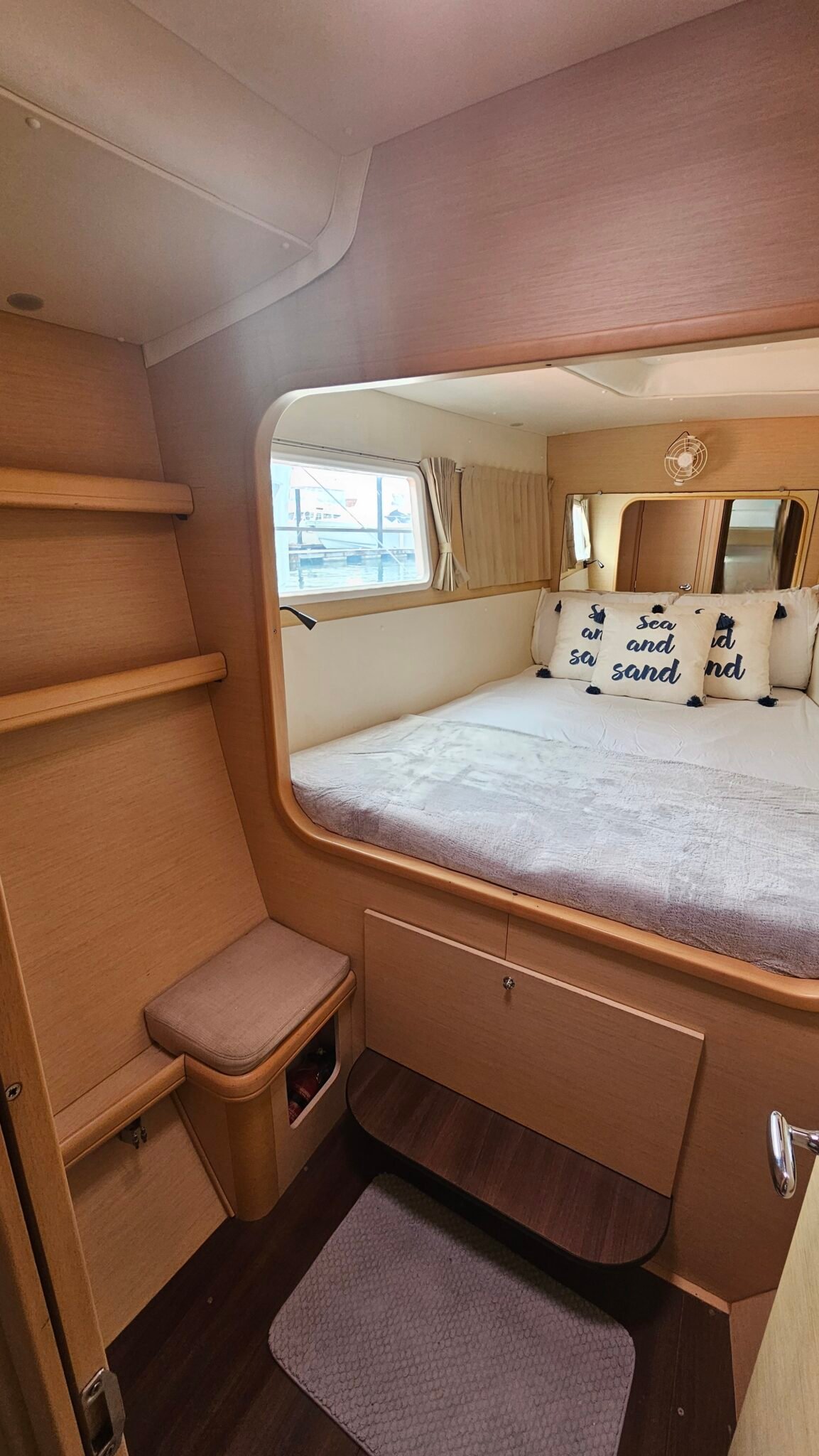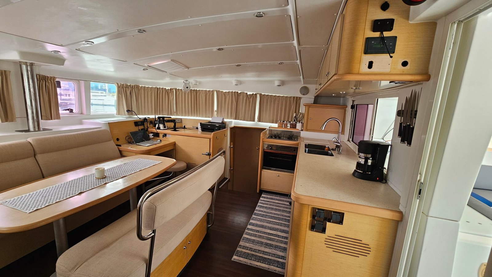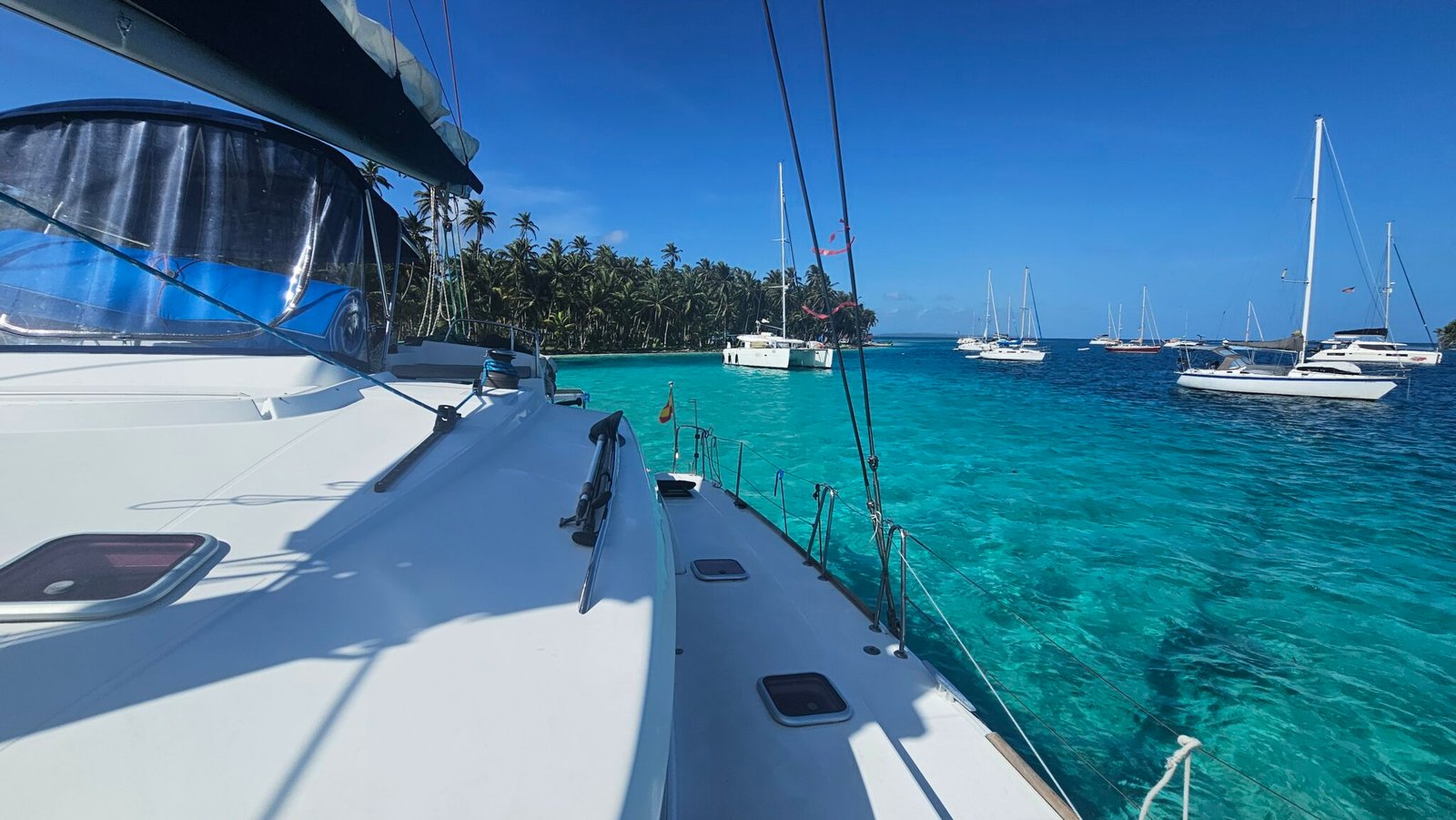 Yoli is a Lagoon 44-foot catamaran designed for comfort and space, with four cabins: two aft cabins with queen beds and private bathrooms, one forward cabin with a double bed and full bathroom, and another forward cabin with a double bed and a bathroom that includes a sink and shower (no toilet). The boat features a panoramic indoor saloon and a large shaded outdoor lounge area. Onboard amenities include Starlink Wi-Fi, bath and beach towels, snorkeling equipment, paddleboards, and a floating mat.