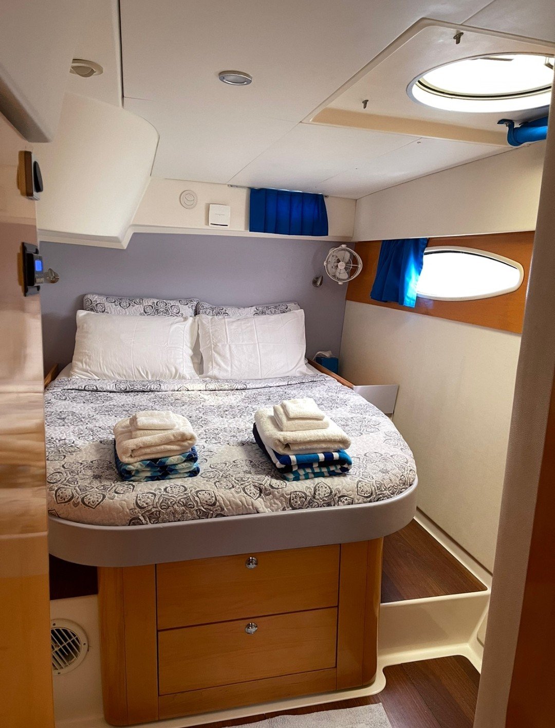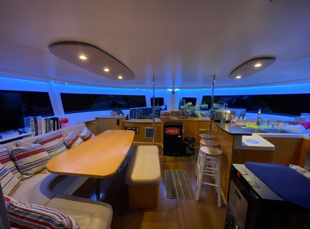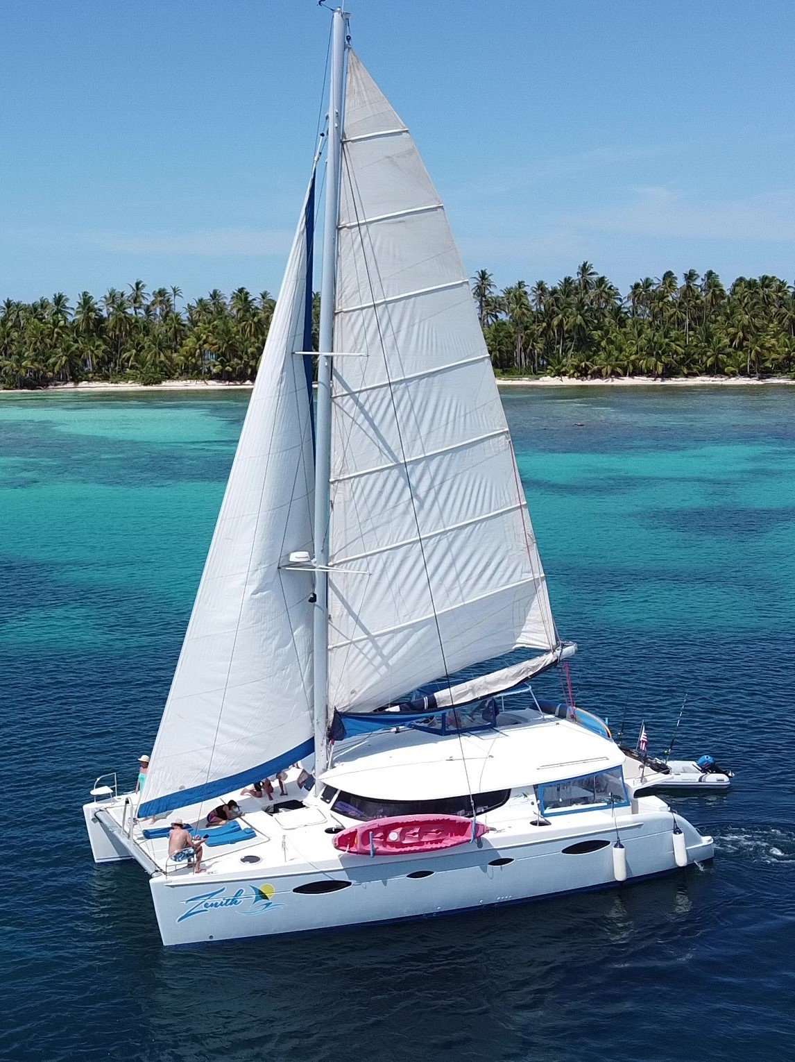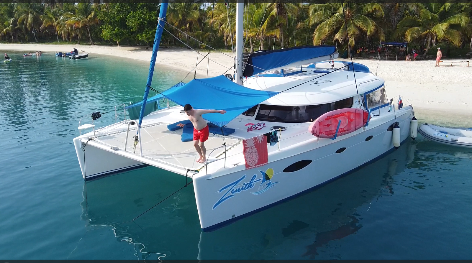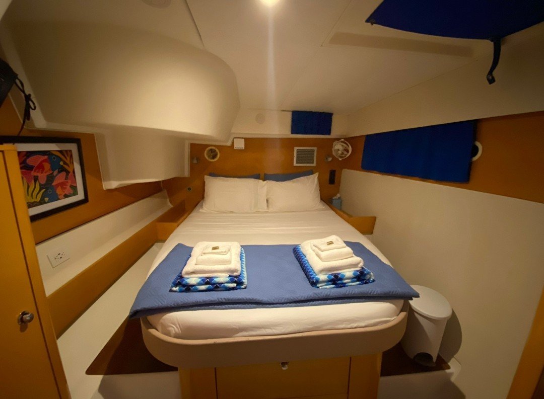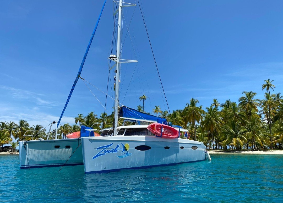 Zenith is a 48-foot Salina Catamaran with 4 private cabins, each with en-suite bathrooms. Two cabins have queen beds, and two have extra-long full-sized beds, ideal for couples. The passageway bunk beds are perfect for teens, with space for small children in the cabins. The air-conditioned saloon offers a cozy spot for dining, socializing, or enjoying movies via Starlink Wi-Fi, while outdoor areas include a shaded cockpit, a spacious trampoline with a sunshade, and a rear sundeck. Zenith is fully equipped for fun with kayaks, paddleboards, snorkeling gear, electric underwater scooters, and beach essentials like umbrellas, mats, and coolers.